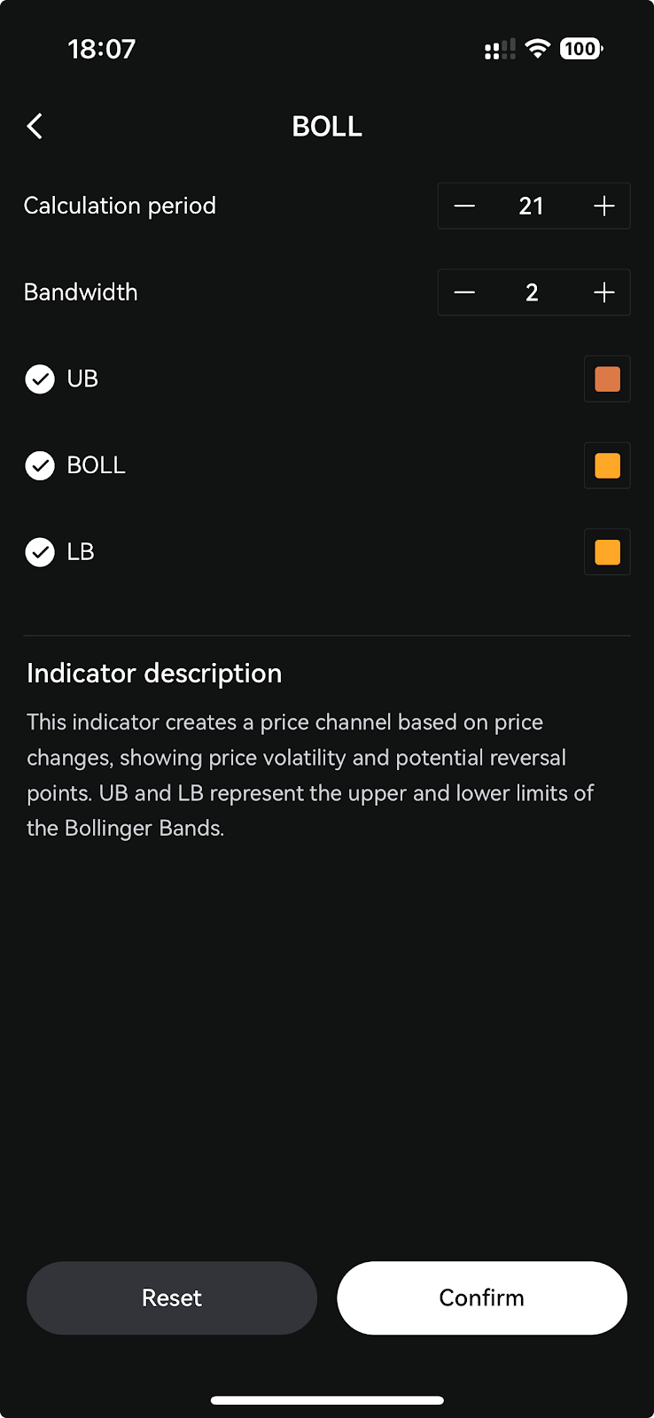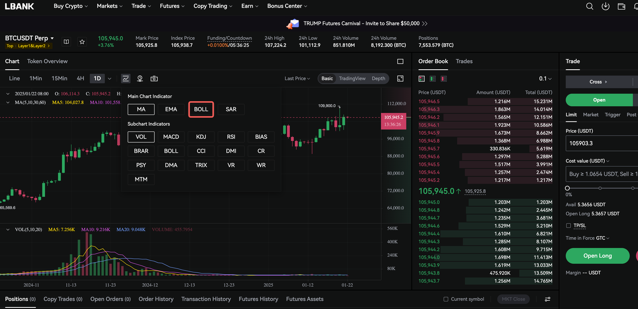 ۷. 【اسپات/فیوچرز】 اضافه شدن اندیکاتور BOLL به چارتهای K-Line و پشتیبانی از انتخاب چندگانه در چارت اصلی اپلیکیشن