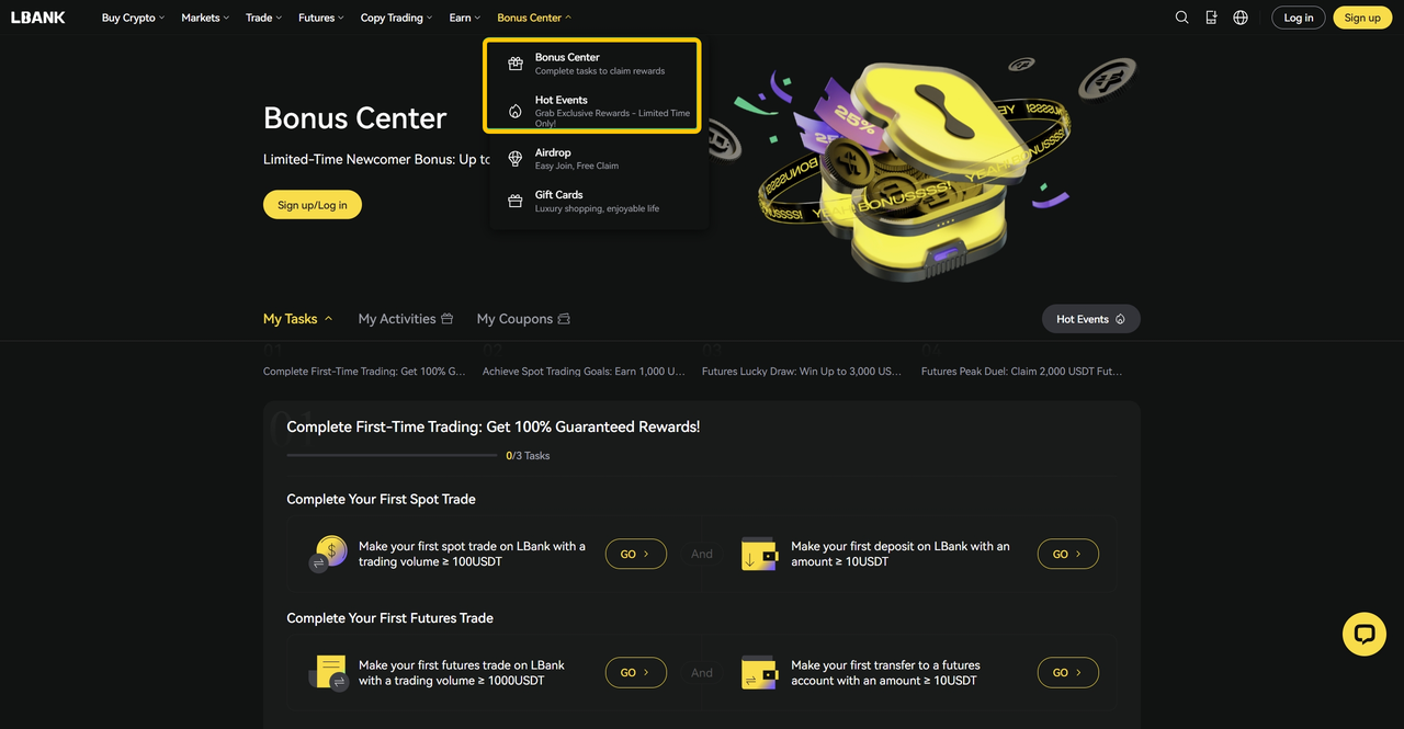 نوار ناوبری صفحه اصلی اکنون شامل ورودیهای مرکز پاداش (https://www.lbank.com/my-tasks) و رویدادهای داغ (https://www.lbank.com/popular-events) است. مرکز پاداش تمام رویدادهایی را که کاربران میتوانند در آنها شرکت کنند، گردآوری میکند، در حالی که رویدادهای داغ، رویدادهای محبوب توصیه شده توسط پلتفرم را نمایش میدهد.