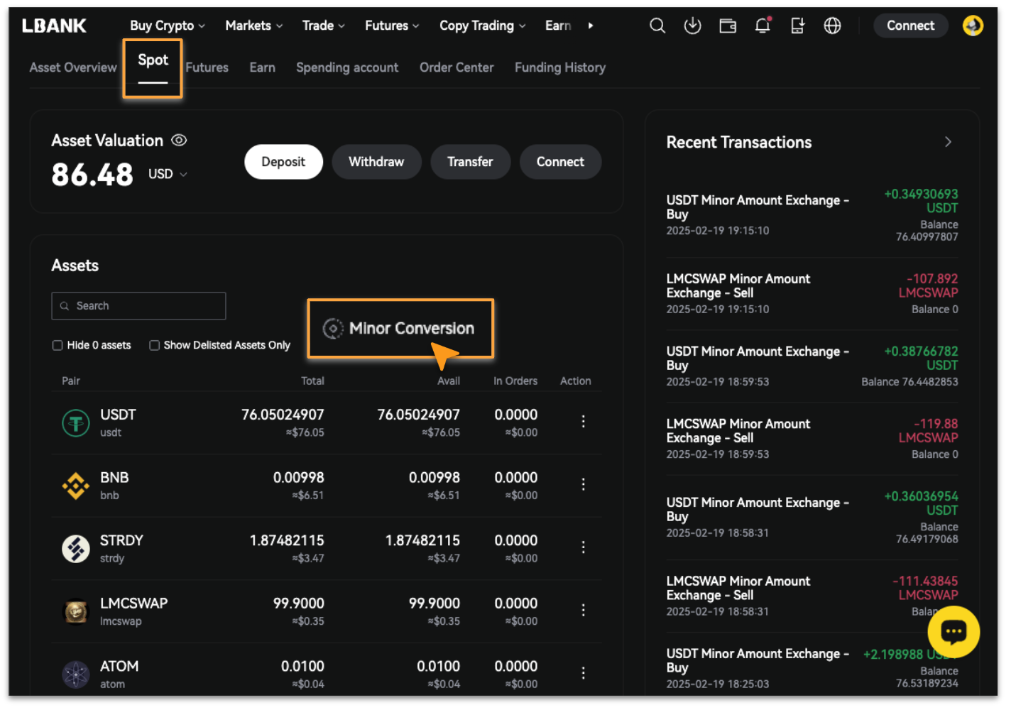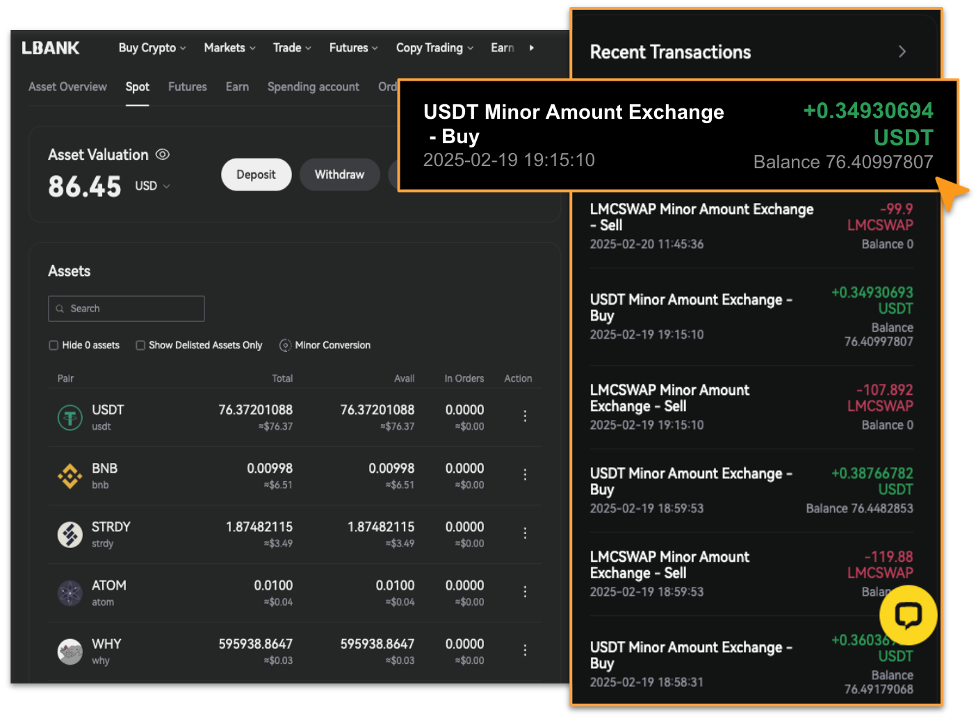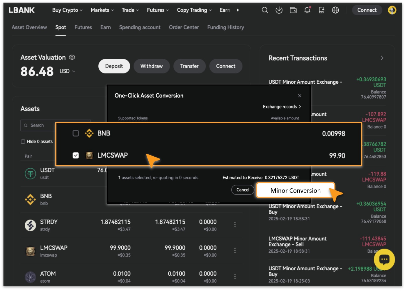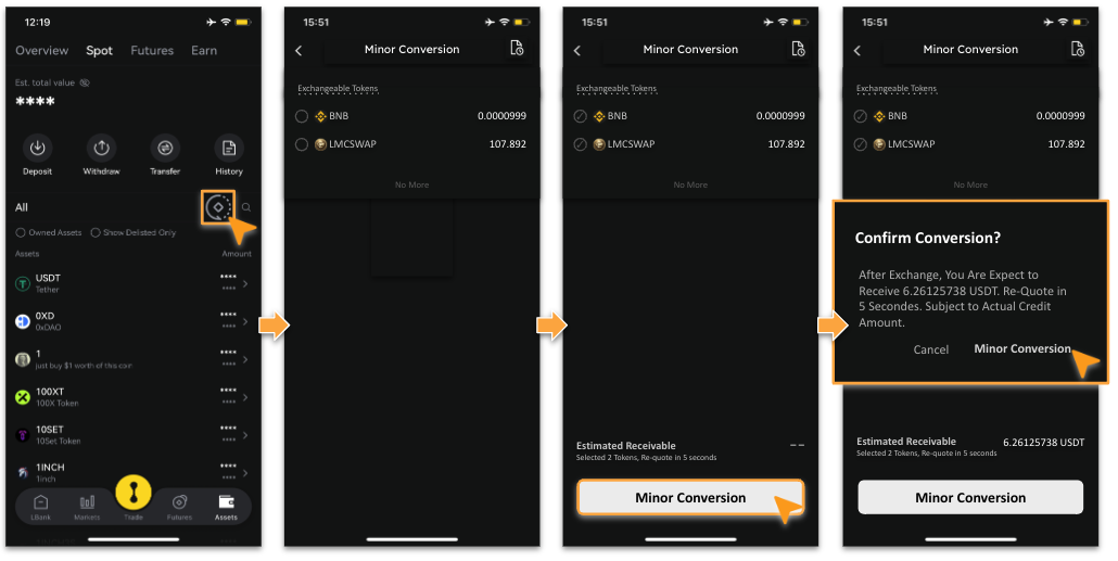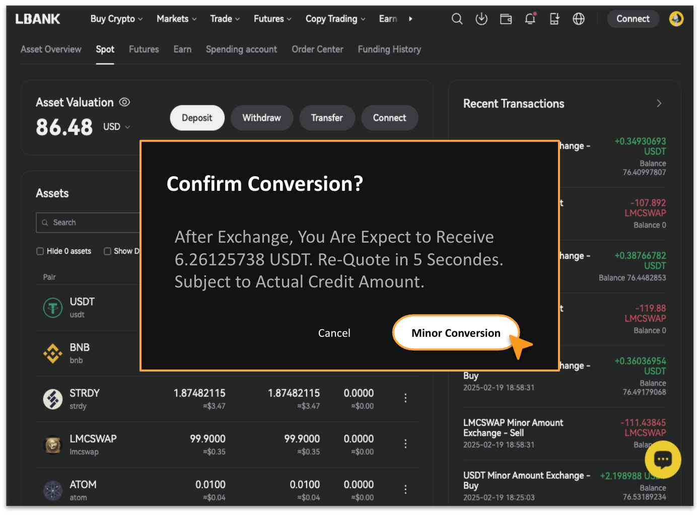 ۵. مقدار موجودی و مقدار تخمینی USDT دریافتی را بررسی کرده و سپس روی [تبدیل مقادیر جزئی] کلیک کنید.