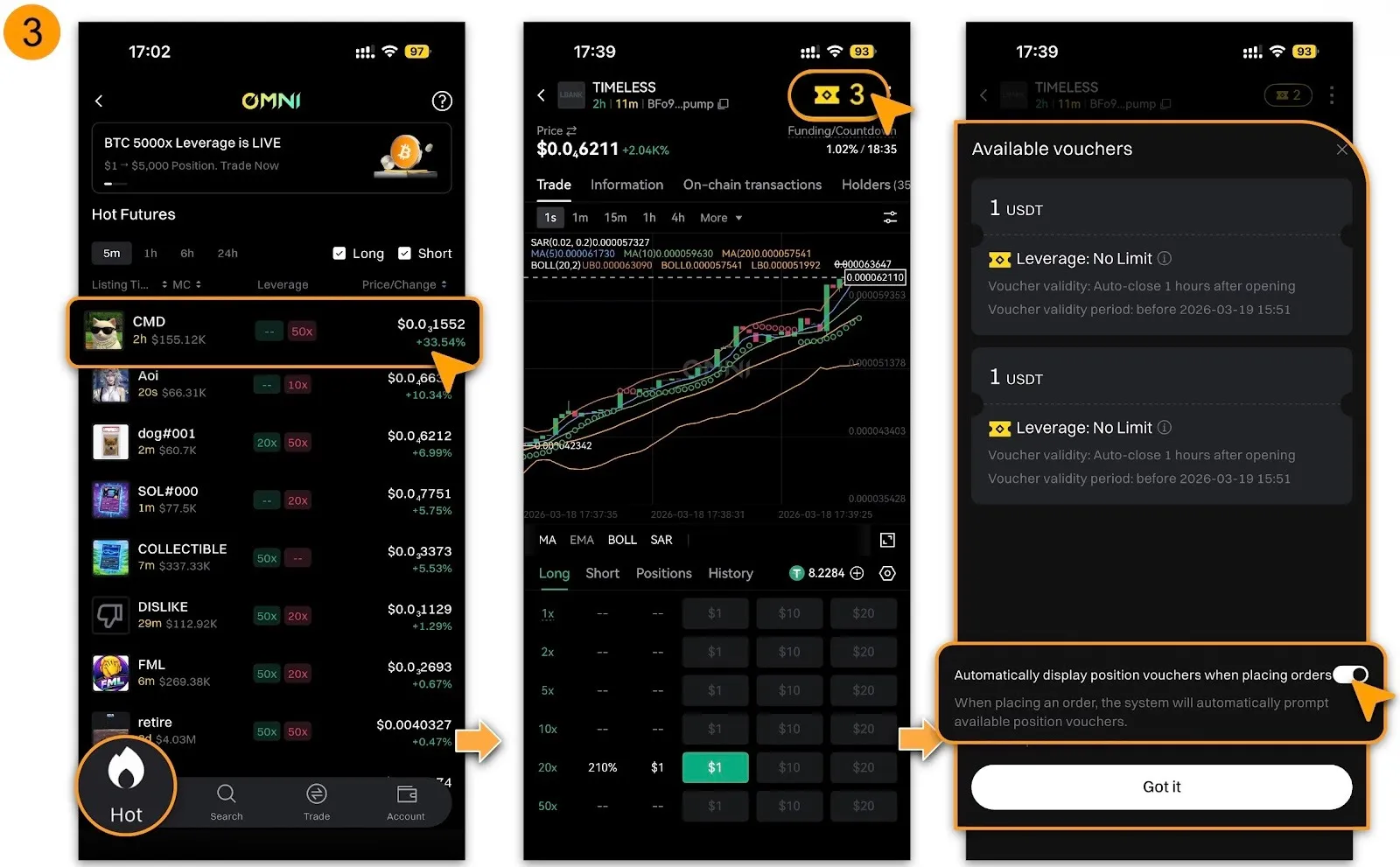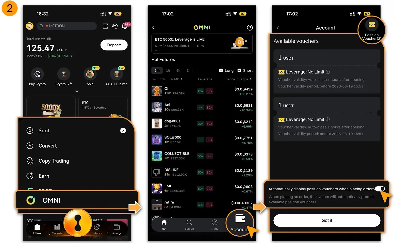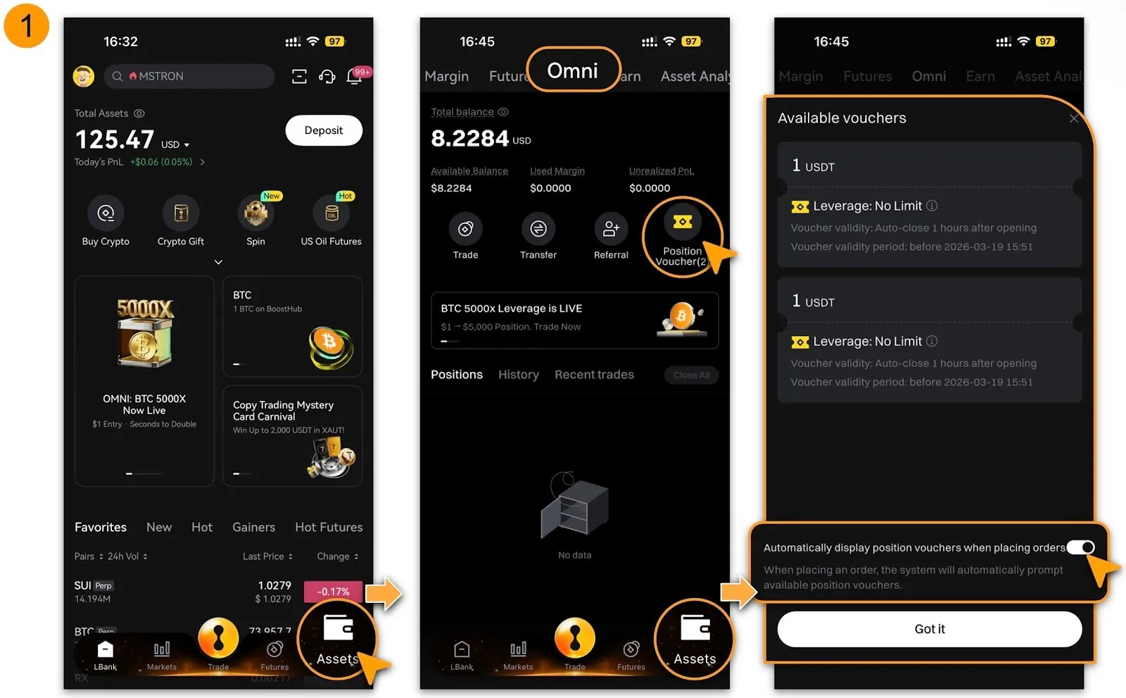 Accédez à Omni, recherchez les paires de trading souhaitées, puis une fois sélectionnées, appuyez sur [Coupons de position] en haut à droite de la page de trading ;