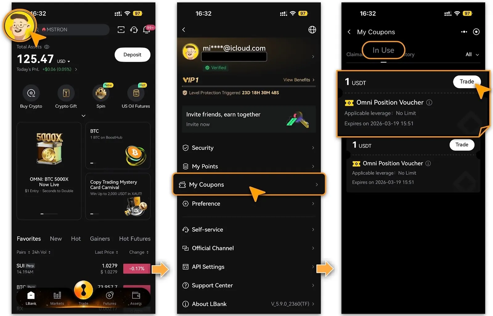 Connectez-vous à votre compte LBank et accédez à [Profil > Mes coupons].