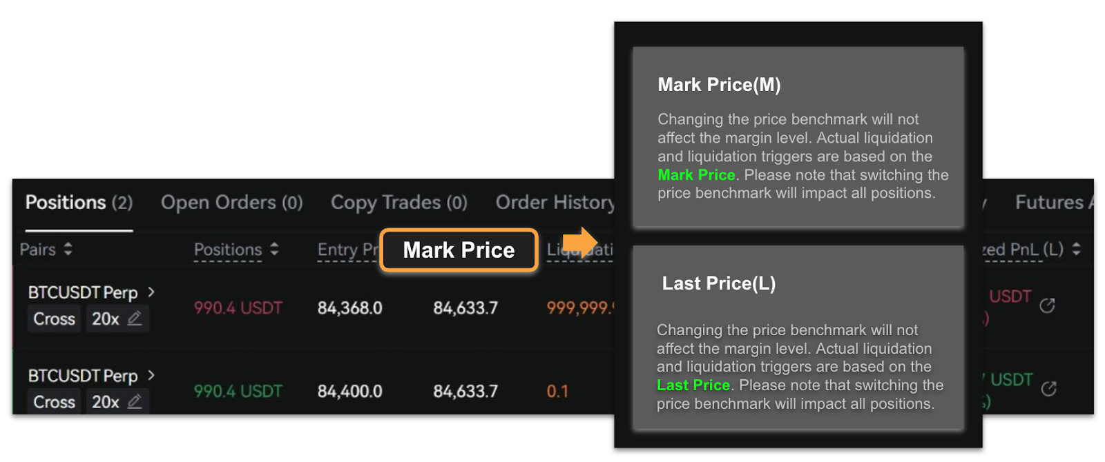 - Por defecto, el PnL No Realizado se muestra con base en el último precio. Los usuarios pueden cambiarlo para calcularlo usando el precio de marca o el último precio.