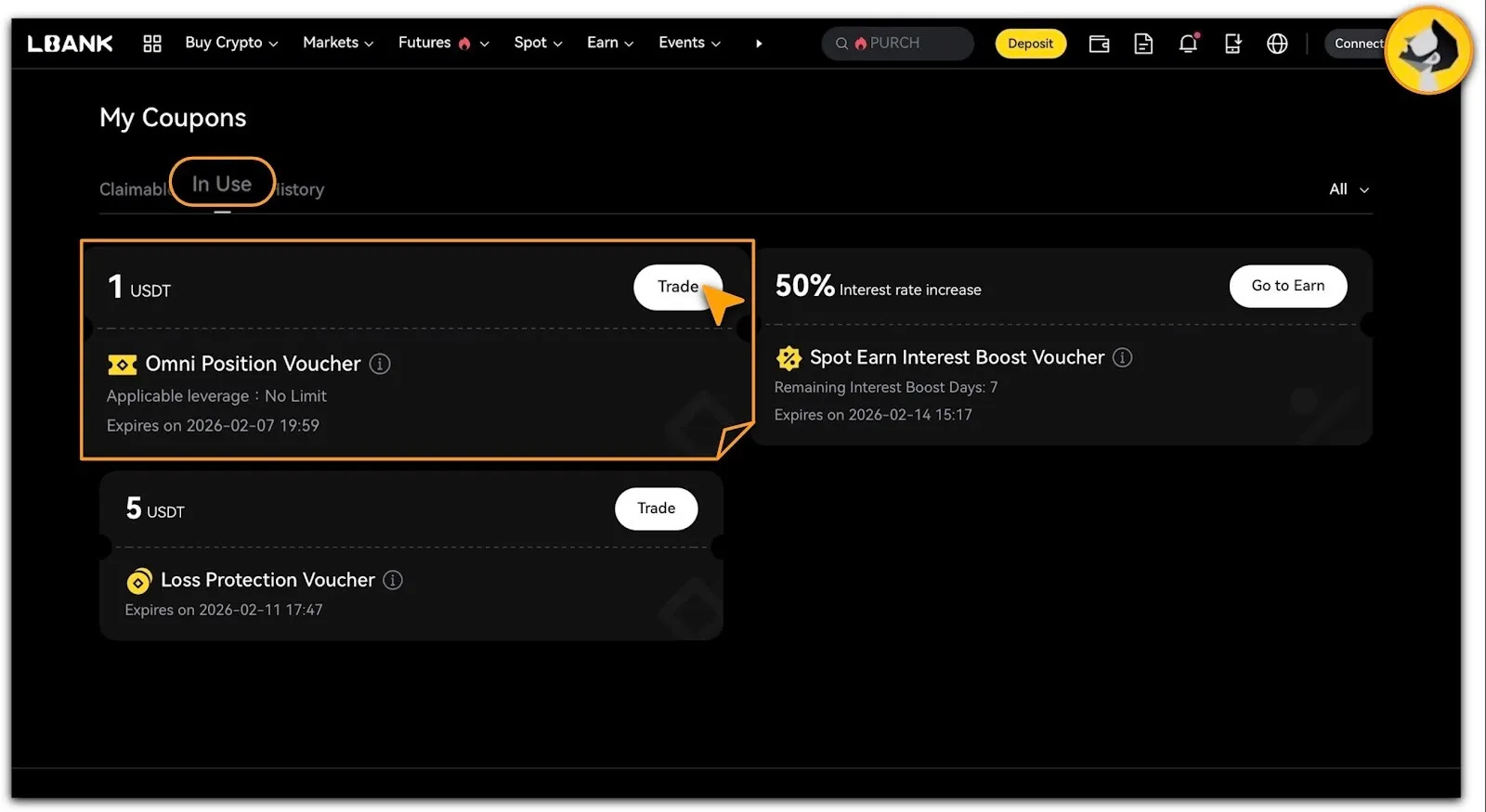 Masuk ke akun LBank kamu dan buka 「Profil > Kupon Saya」.
