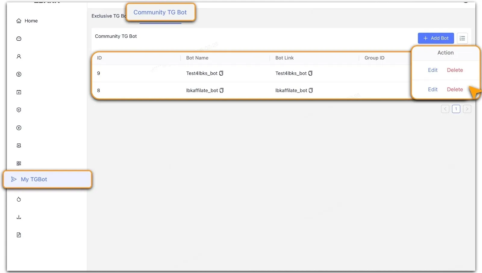 Access「My TG Bot > Community TG Bot」anytime to「Edit」or「Delete」existing bots as needed.