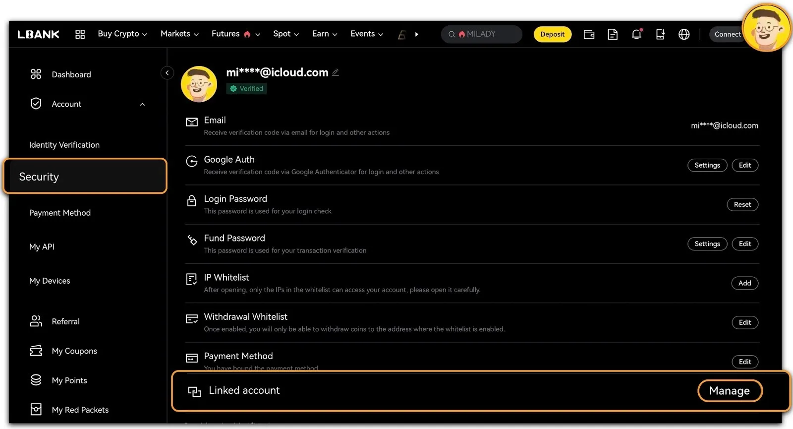 Login to your LBank account, go to「Profile > Security」, then tap「Linked Account > Manage」to connect your Telegram account.