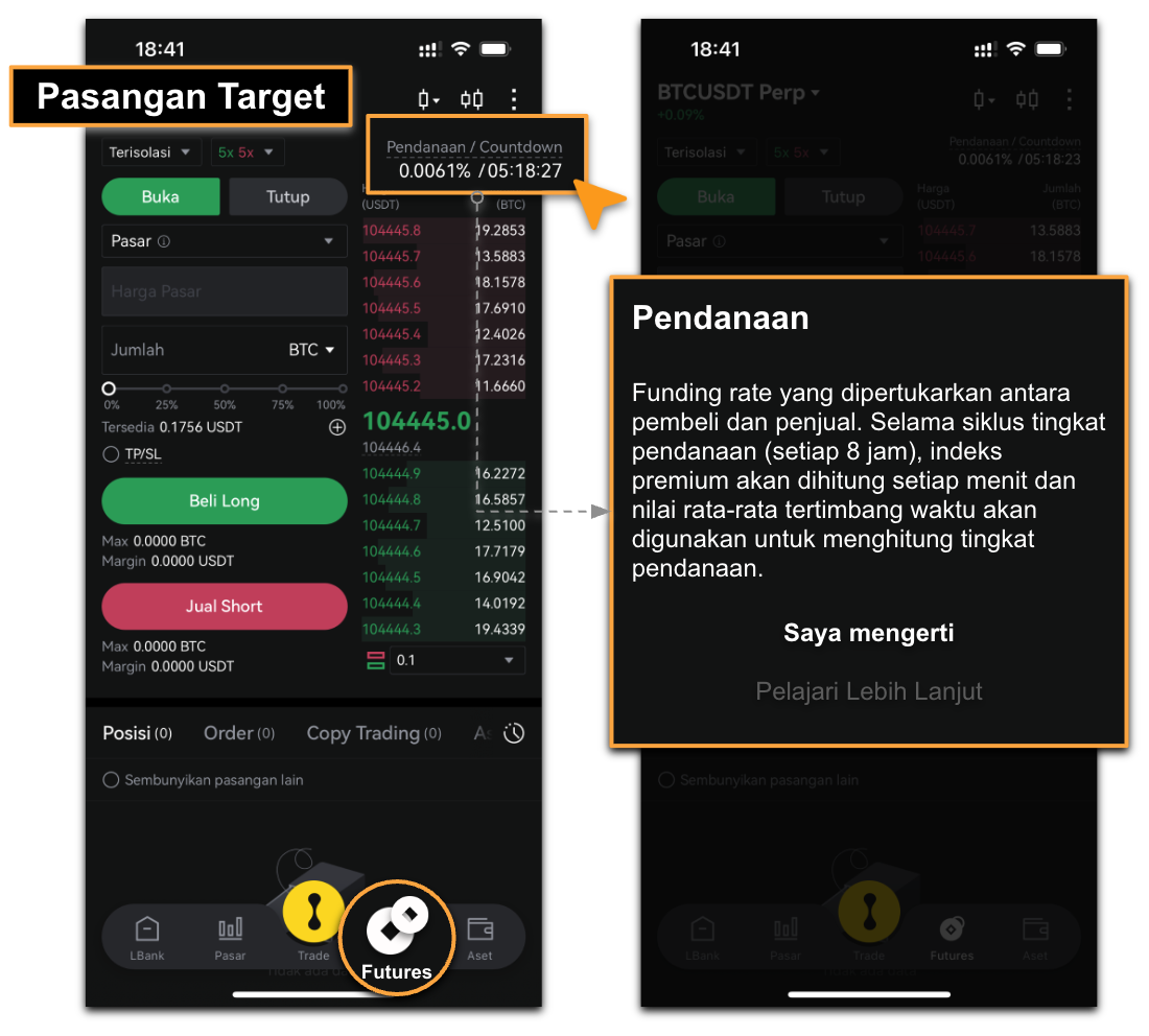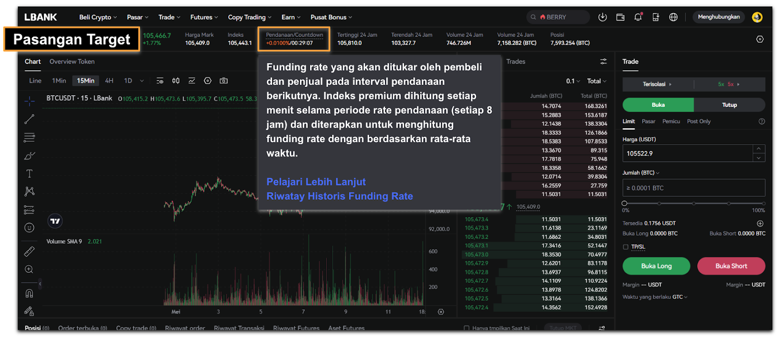 Pada platform futures trading LBank, waktu penghitungan biaya pendanaan bervariasi berdasarkan crypto. Untuk melihat interval pengumpulan tingkat pendanaan untuk token crypto tertentu, navigasikan ke halaman futures trading, pilih token crypto, dan klik tingkat pendanaan dan penghitung waktu mundur di pojok kanan atas. Sebuah pop-up akan menampilkan detail yang relevan.