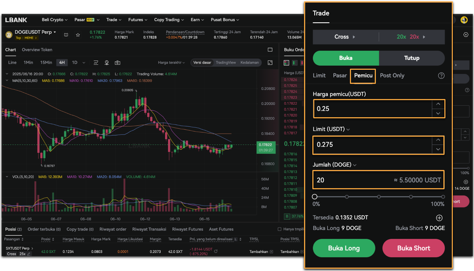 1. Pilih [Pemicu], masukkan [Harga Pemicu], [Limit] dan [jumlah], lalu klik [Buka Long] atau [Buka Short].