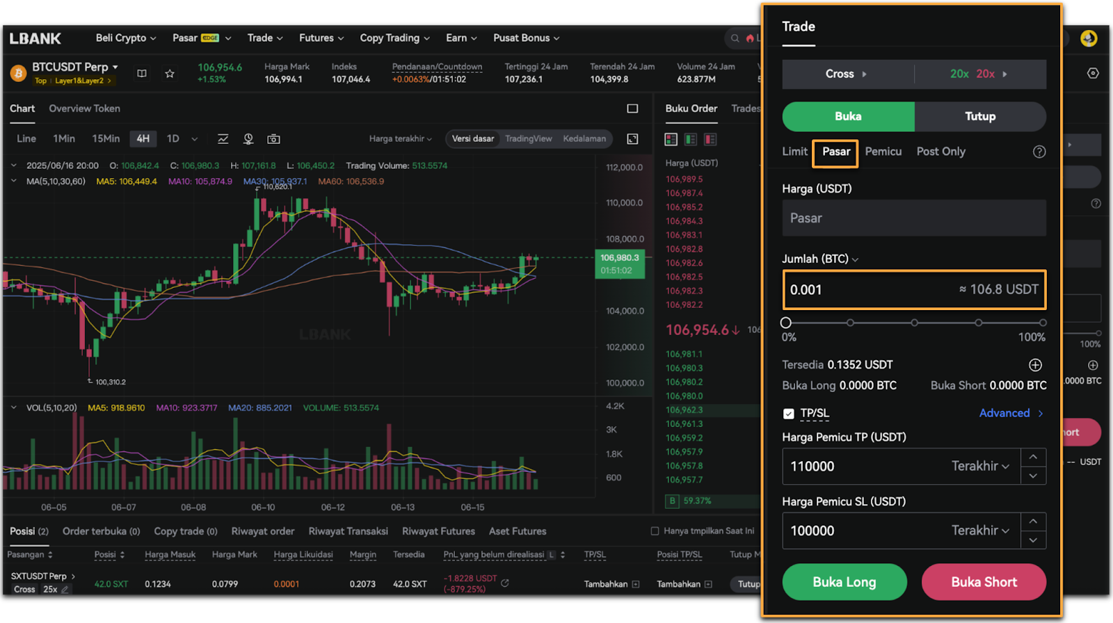 1. Pilih [Pasar], masukkan [Jumlah], dan klik [Buka Long] atau [Buka Short].