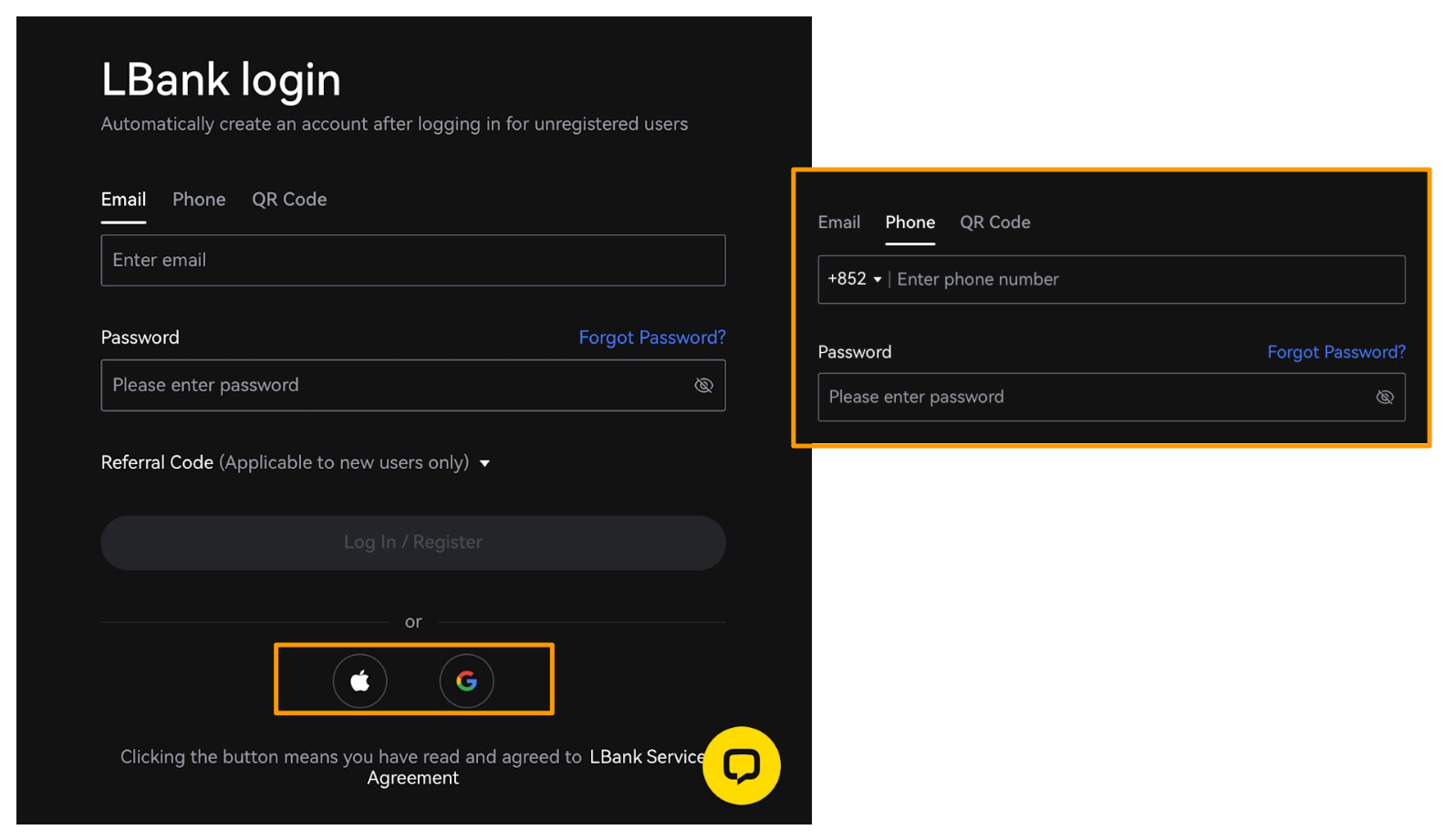 - Masukkan email atau nomor telepon Anda (atau masuk dengan akun pihak ketiga); Tetapkan kata sandi masuk Anda dan klik [Masuk / Daftar]