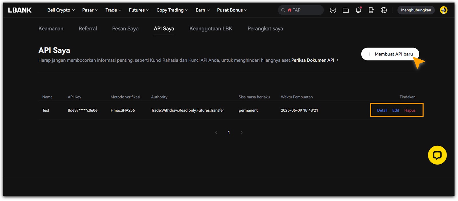 - Klik [Membuat API Baru] atau kelola API yang sudah ada melalui [Detail], [Edit], atau [Hapus].