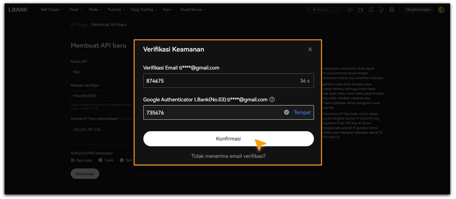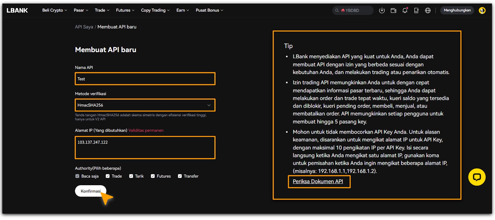 - Tentukan tujuan API (Baca Saja, Trade, Tarik, Futures, Transfer; beberapa pilihan diperbolehkan); Klik [Konfirmasi].