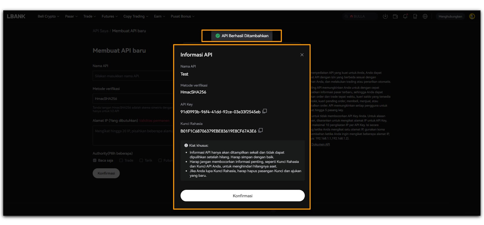 - Klik [Konfirmasi] dan kelola API Anda dari daftar [API Saya].