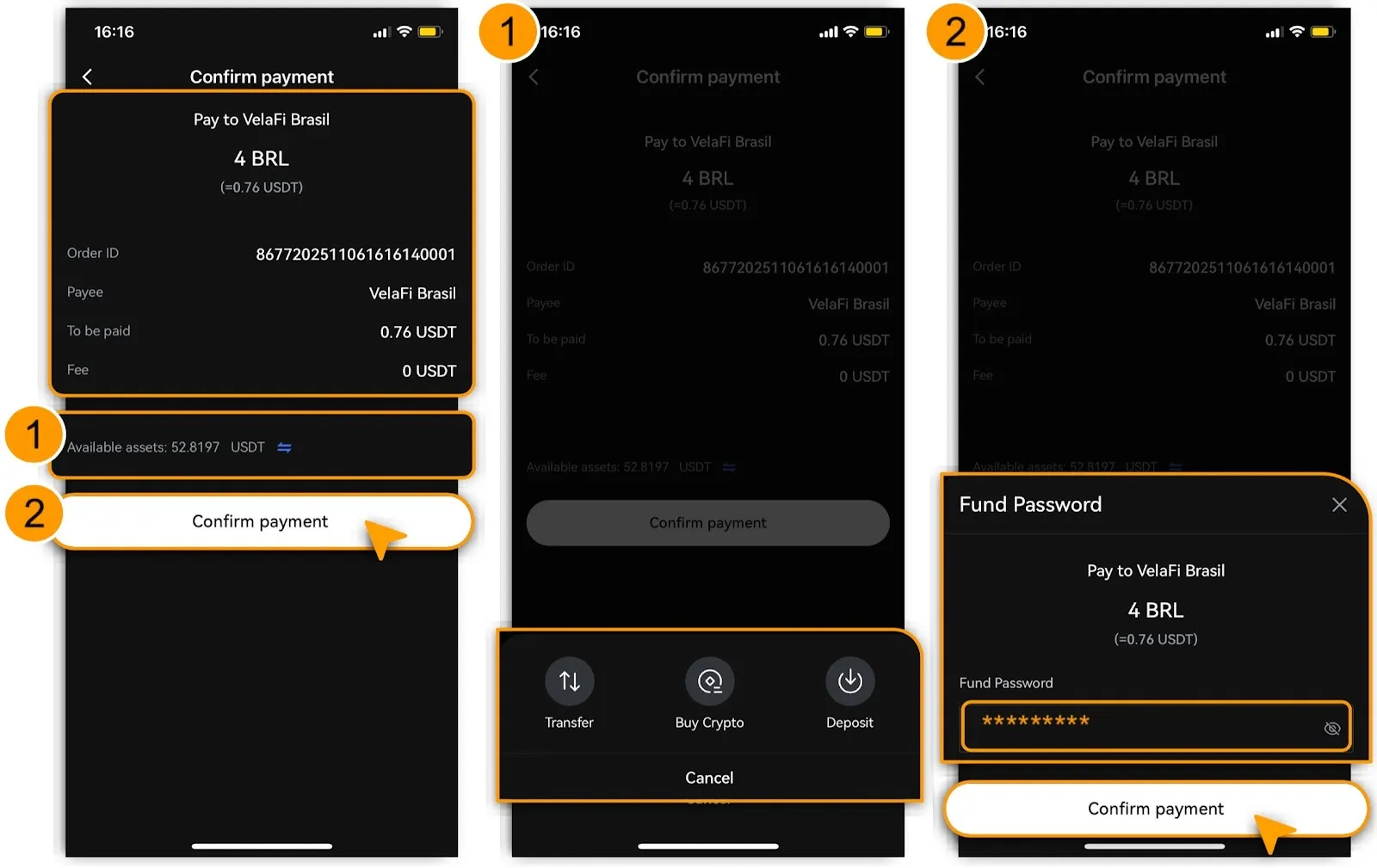 After confirming order details, tap「Confirm Payment」and enter your「Fund Password」.