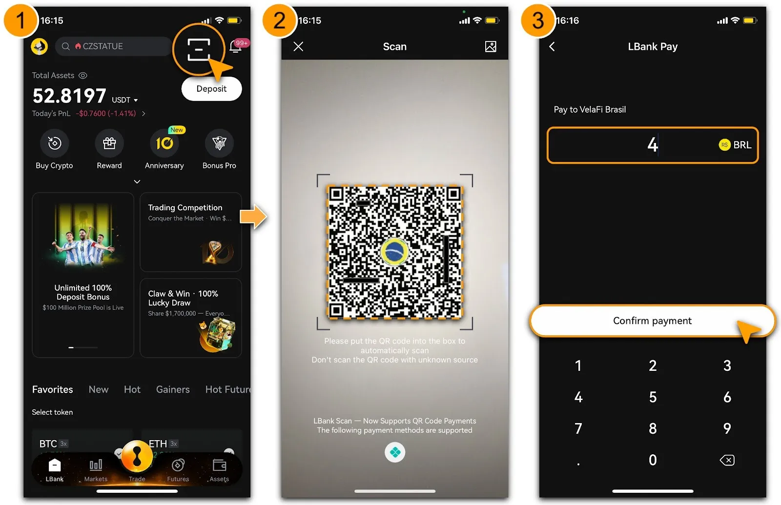 Tap the「Scan」 icon in the top-right corner of the LBank homepage, align with the merchant’s PIX QR code, and the system will parse it automatically:
