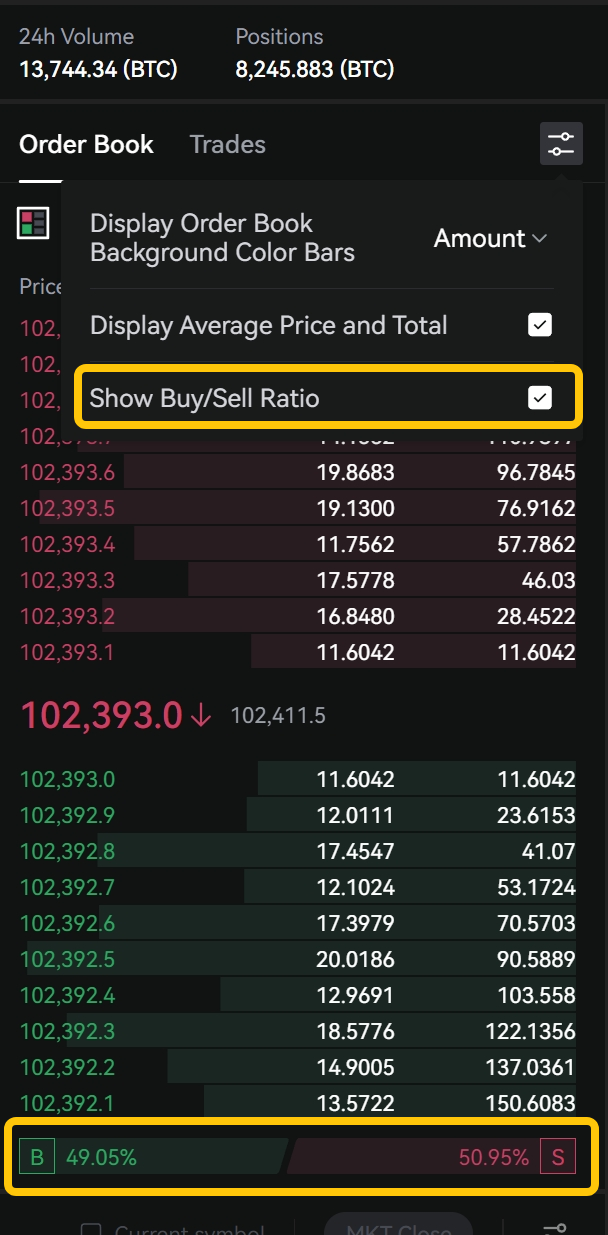- O livro de ordens agora exibe em tempo real a razão entre ordens de compra e venda, com um botão de alternância de exibição — oferecendo uma visão clara do sentimento do mercado em tempo real.
