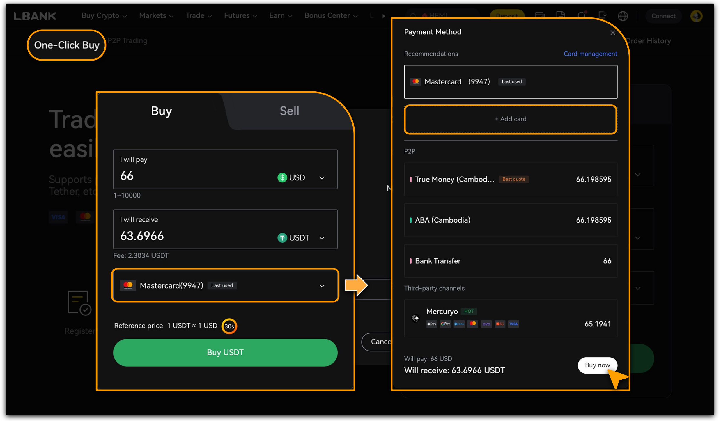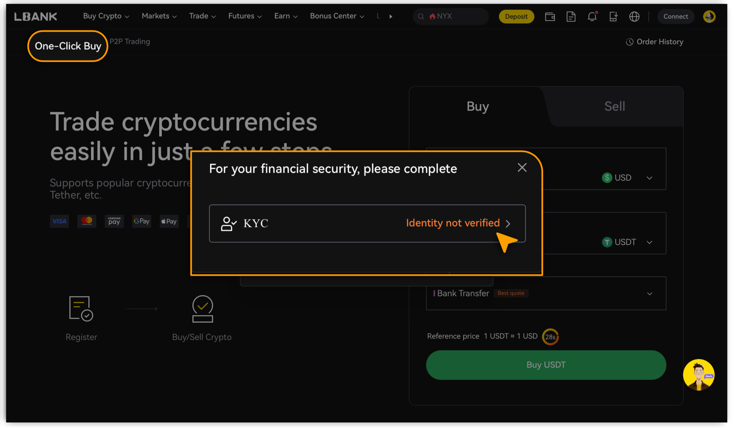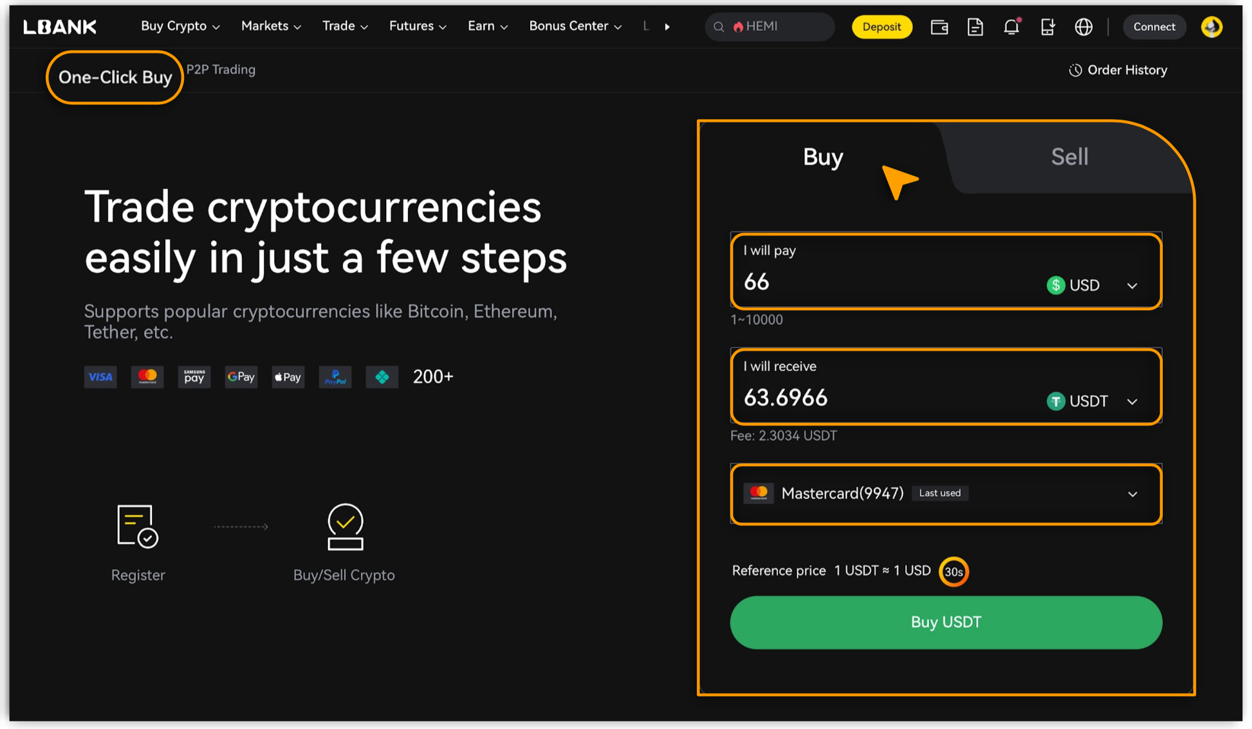 LBank, a leading global cryptocurrency exchange since 2015, is committed to providing a secure and convenient trading experience. We support over 800 cryptocurrencies, including USDT, Bitcoin (BTC), Ethereum (ETH), and more, with multiple payment methods for seamless fiat-to-crypto transactions (e.g., USD, EUR). This guide outlines the “One-Click Buy/Sell” process to help you efficiently buy and sell cryptocurrencies.