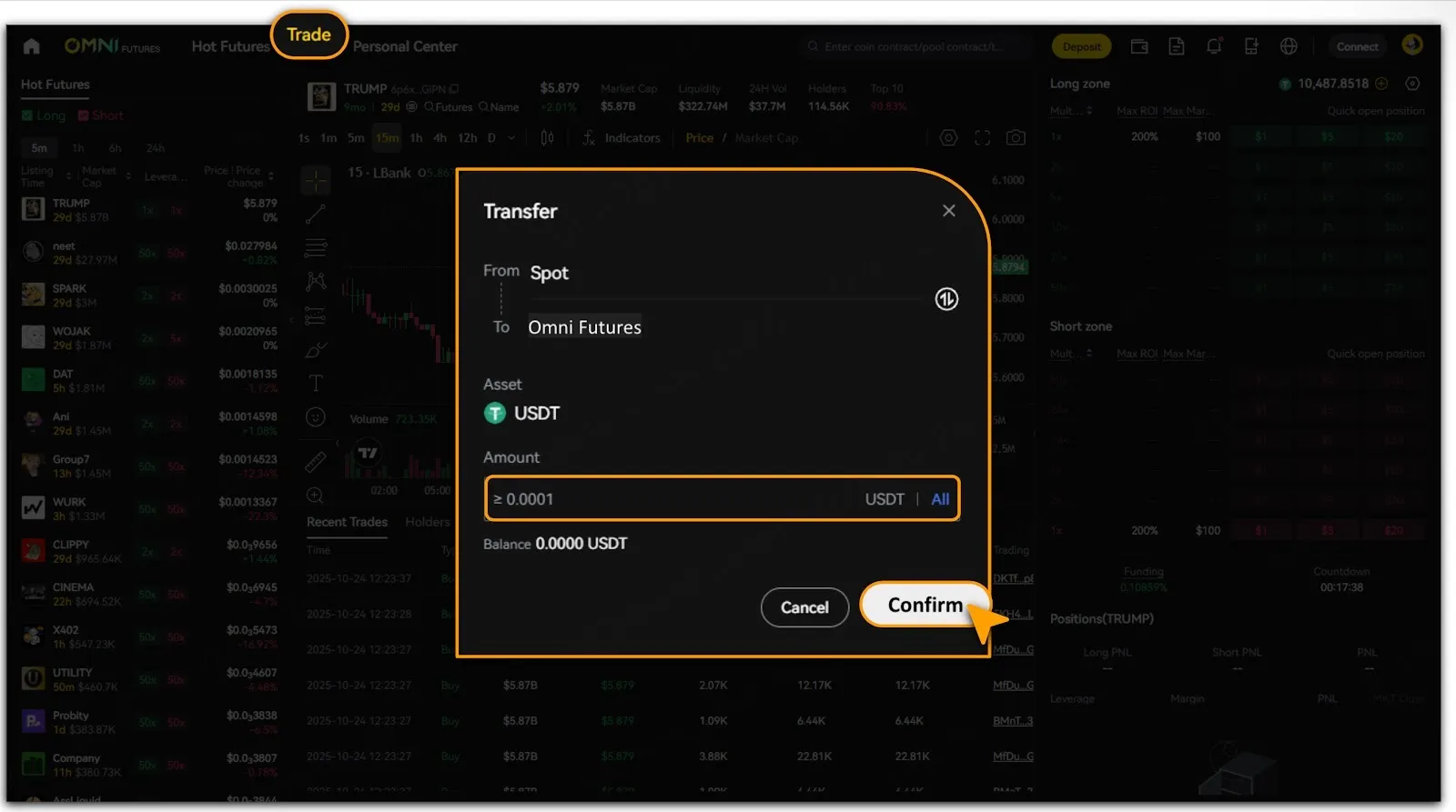 Select「Spot > Omni Futures」, enter funding amount and tap「Confirm」.
