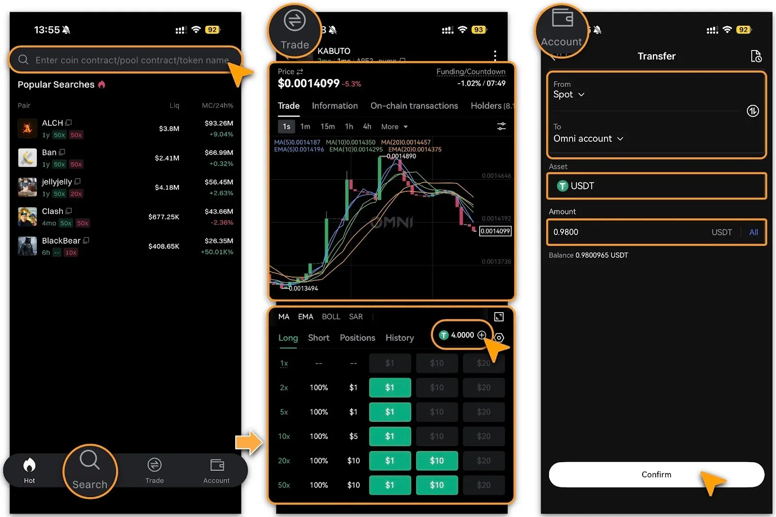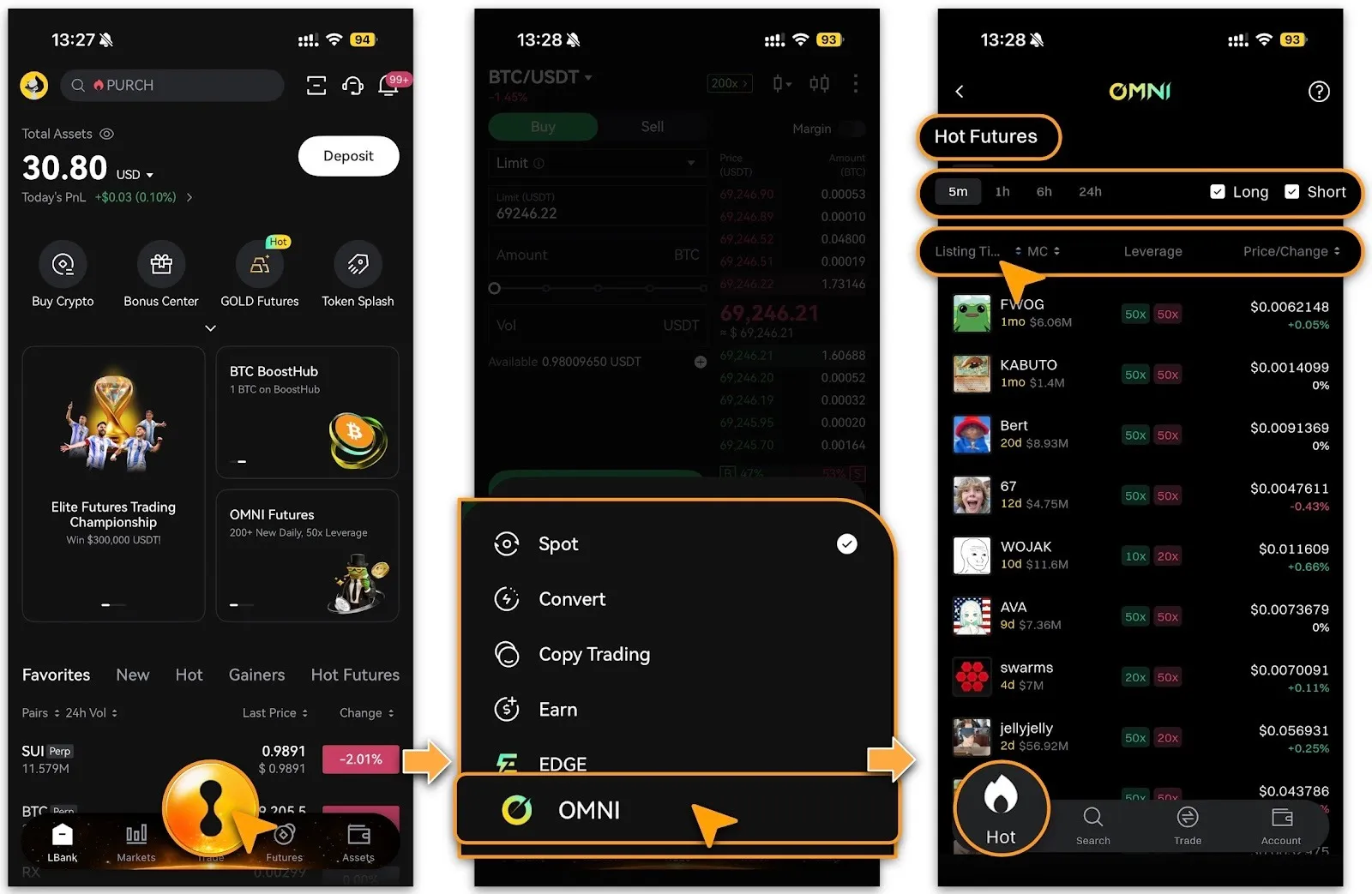 Login to LBank App, double click「Trade」and select「OMNI」from pop-up menu;