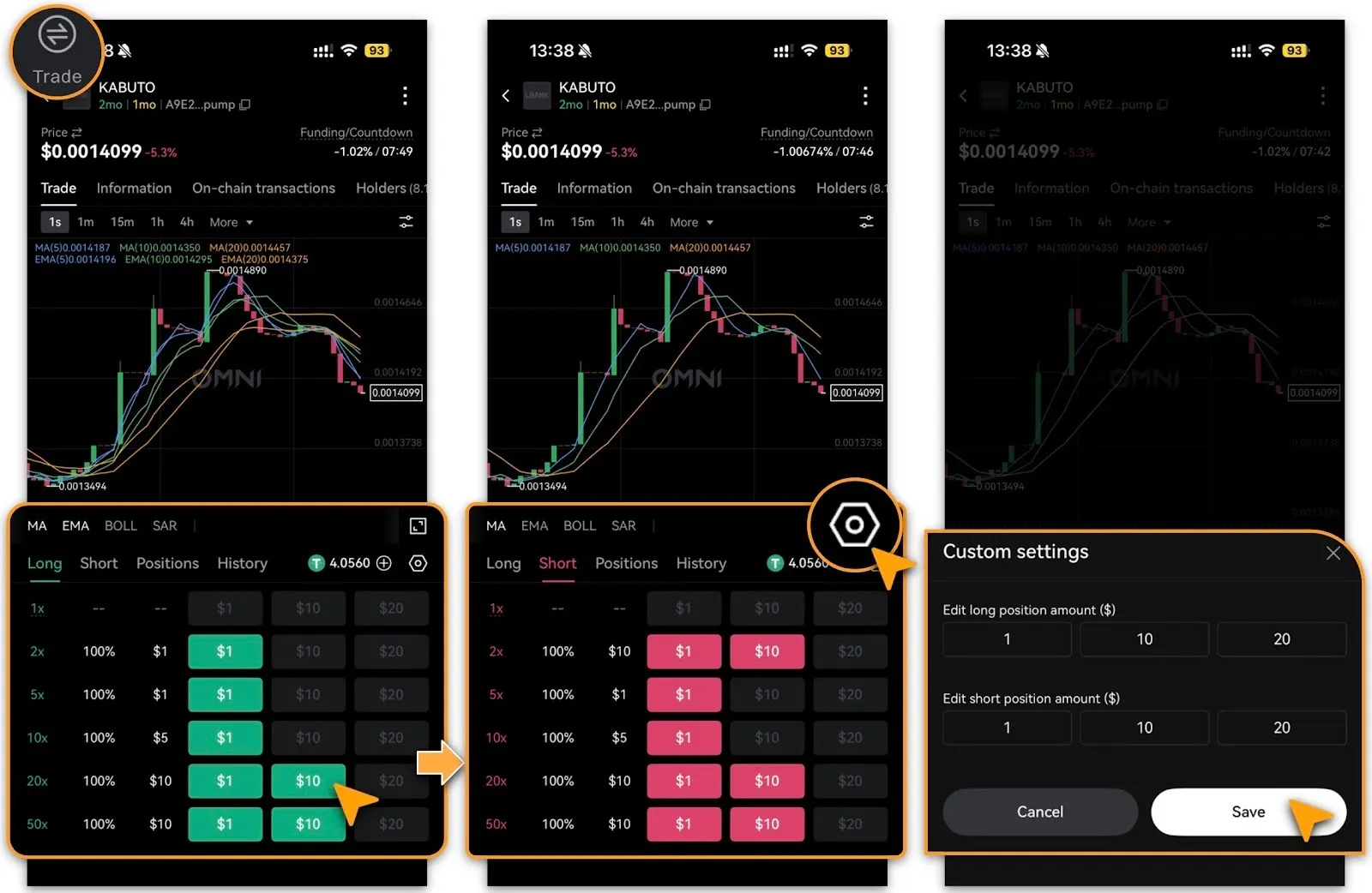 Users can also view leverage, maximum profit rate, and maximum margin, and tap「Long(green)」or 「Short(red)」at any time to adjust positions.