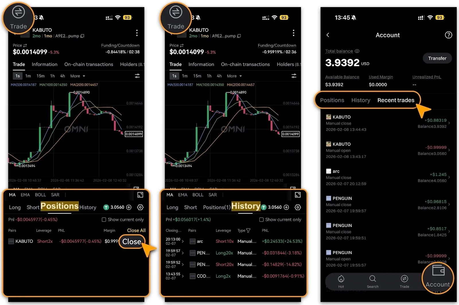 Position Records: On the details page for a specific trading pair, go to「Account」and filter by「Positions」,「History」, or「Recent Trades」to view profit and loss.
