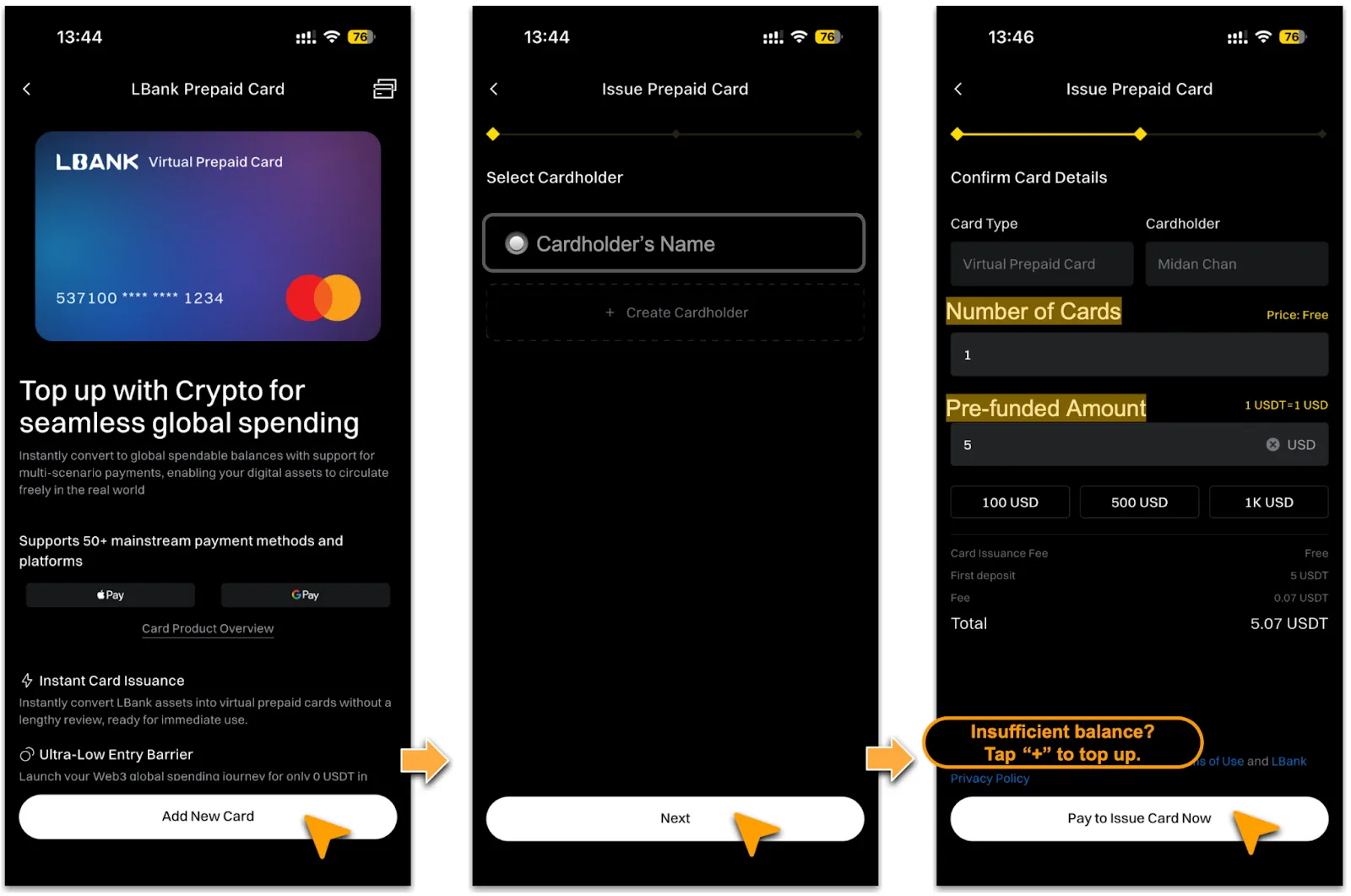 • LBank Prepaid Card comes with a pre-loaded balance for spending. Additional top-ups are not supported, and any remaining balance cannot be cashed out.