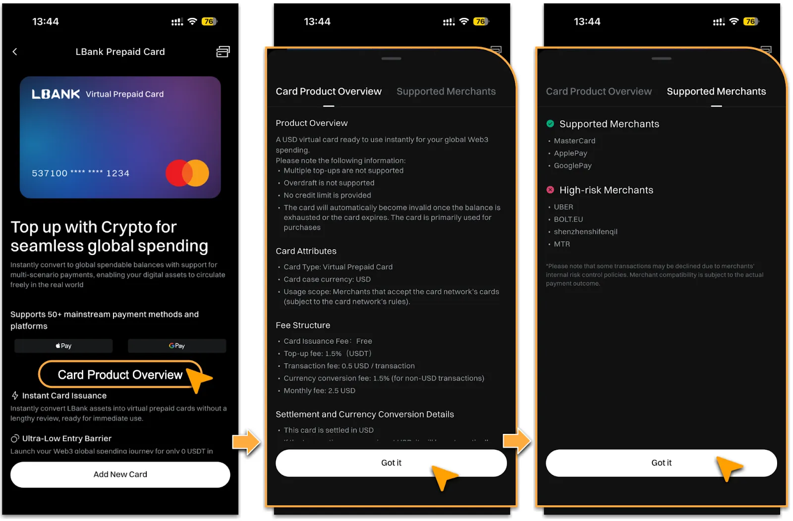 • The LBank Prepaid Card can be used at most Visa/Mastercard merchants, both online and offline. However, some high-risk merchant categories, such as certain subscription platforms and financial services, may not be supported.