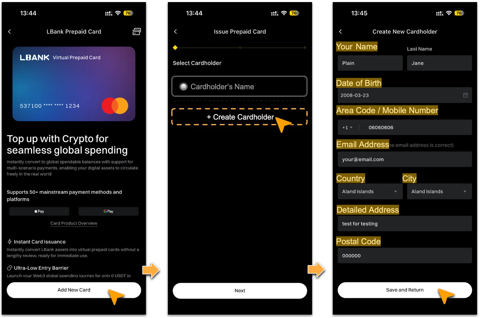 📌If you have completed KYC verification on LBank, your name and contact details will be auto-filled. You can save up to 5 cardholder profiles at a time.
