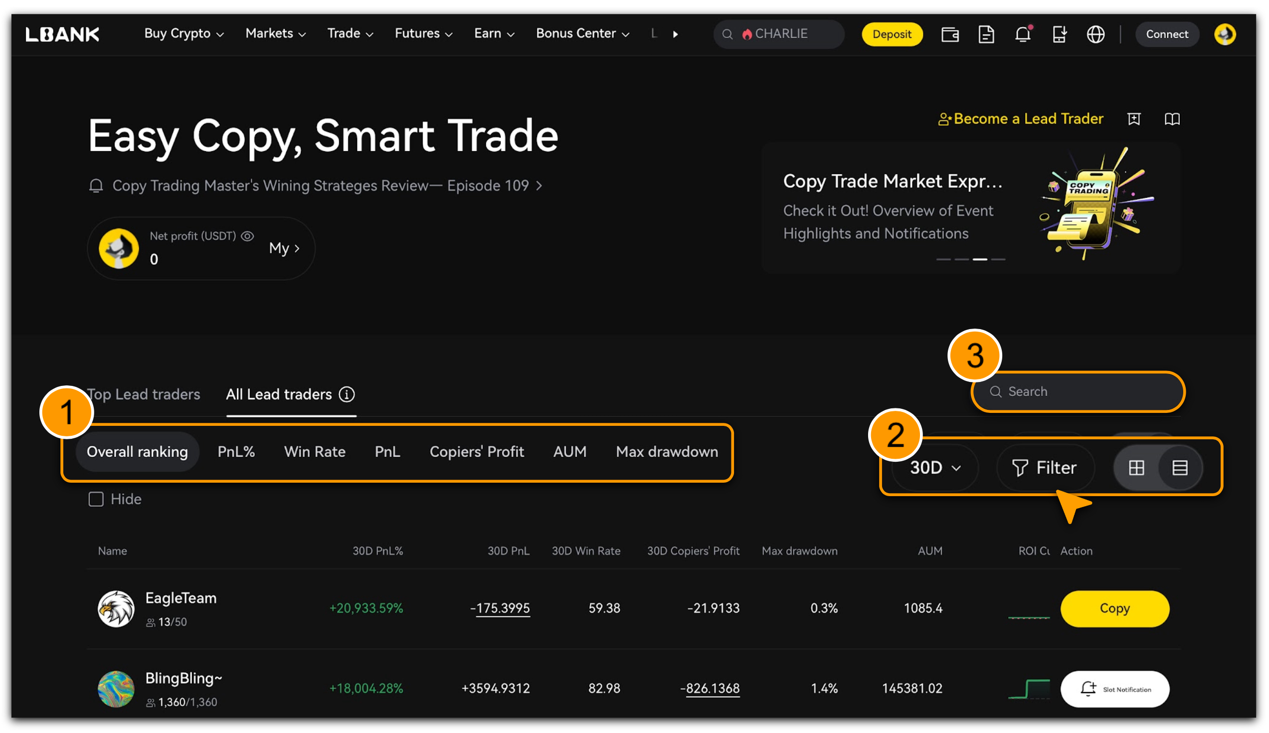 In the 「All Lead Traders」 list, sort by criteria「Overall Ranking」, 「PnL%」, 「Win Rate」, 「PnL」, 「Copiers’ Profit」, 「AUM (Assets Under Management)」, or 「Max Drawdown」.