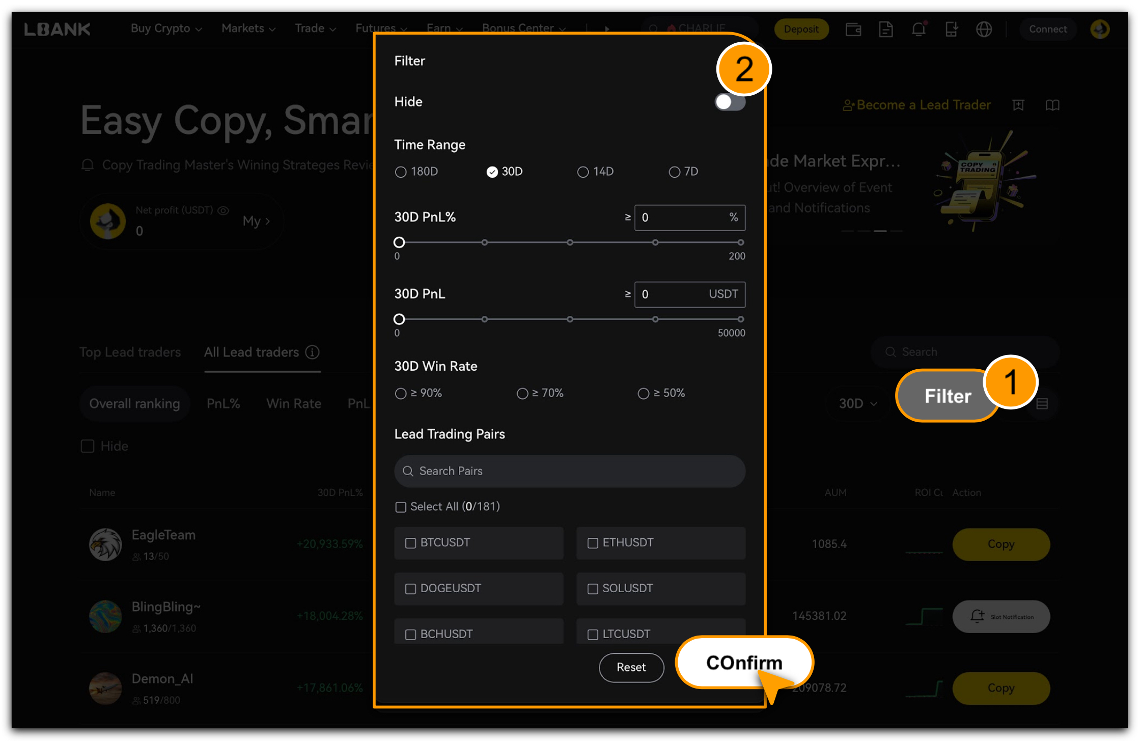 Log in to your LBank account and navigate to 「Futures > Copy Trading > Copy Trading」 to access further.