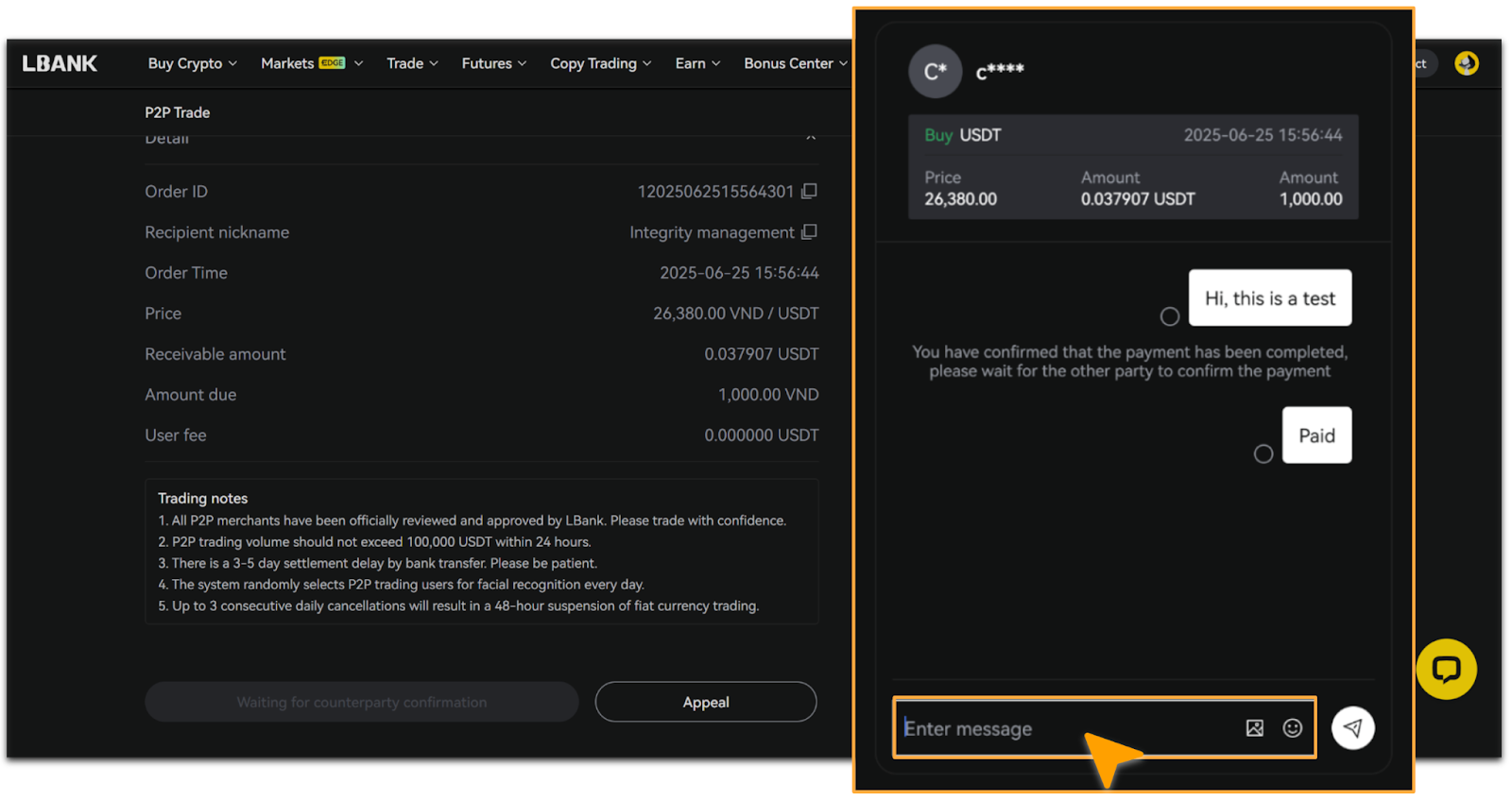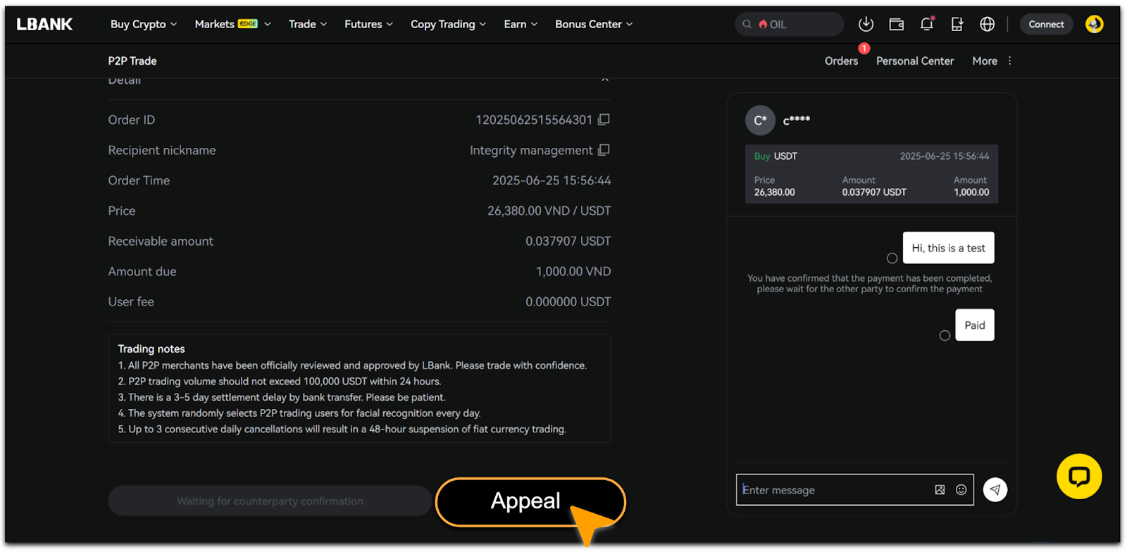 If the cryptocurrency isn’t received after clicking [Confirm], tap [Appeal] to contact Customer Support.