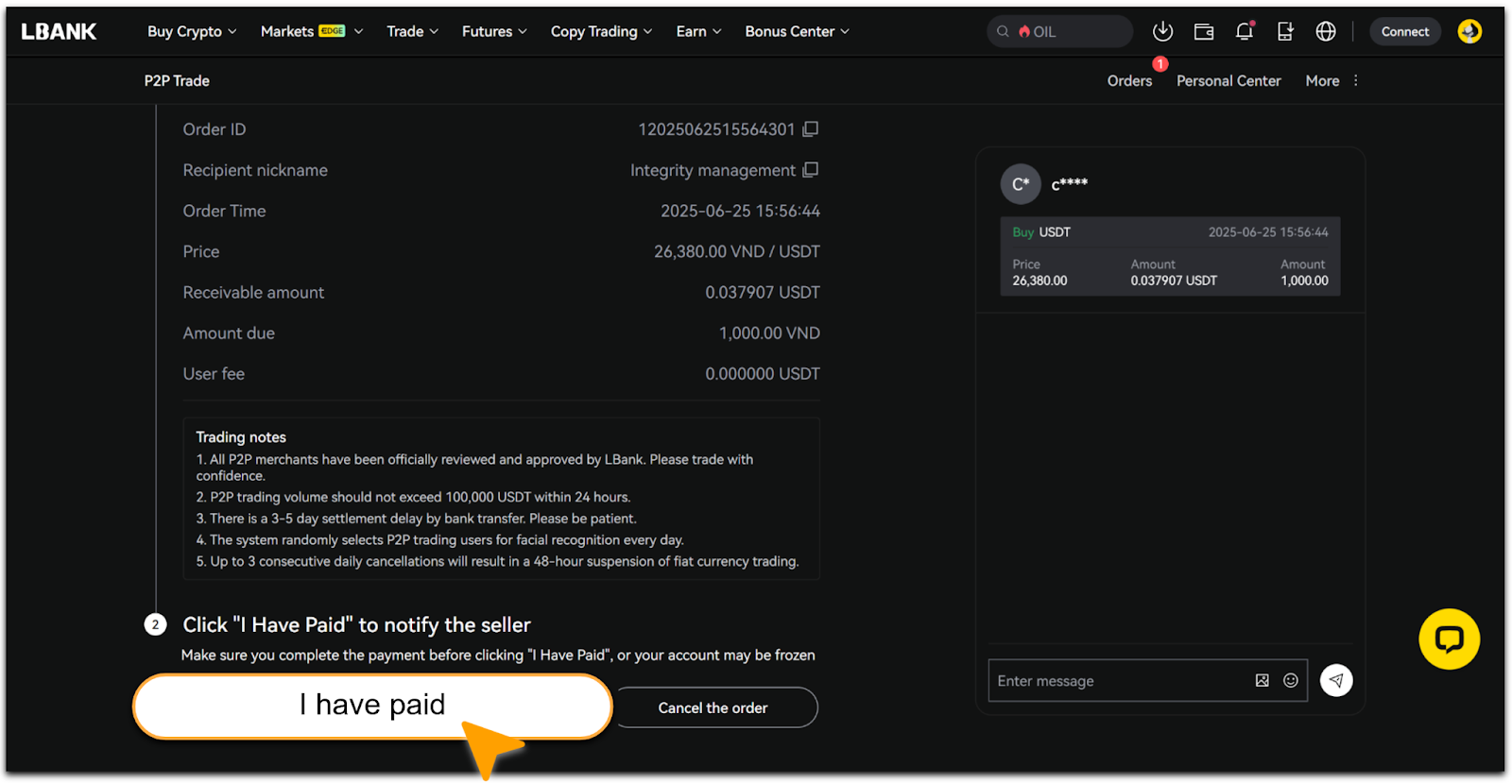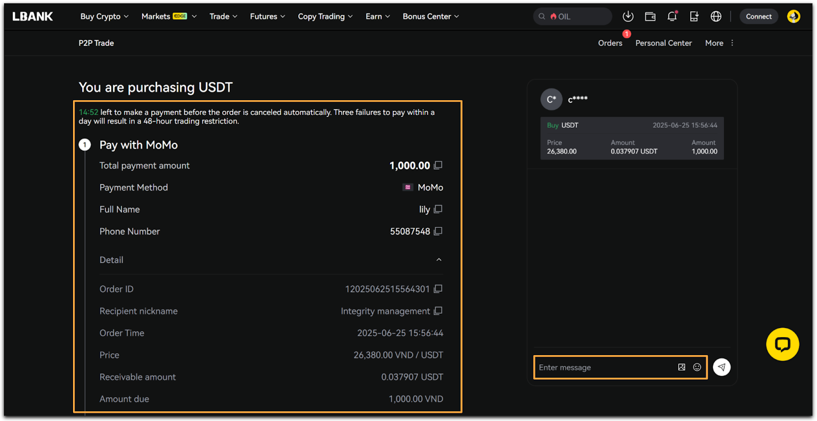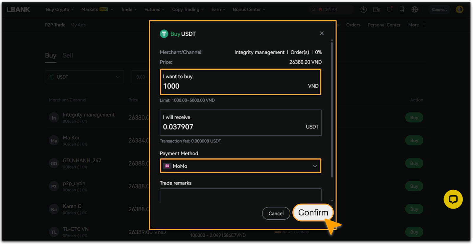 Take [Buying USDT with 1000 VND] as an example, follow the steps below to buy.