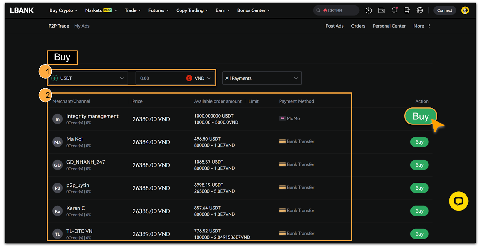 Select the cryptocurrency you want to buy and find suitable P2P advertisements. Check the seller’s [Trade Limit] and [Payment Methods], then tap [Buy] on your preferred offer.
