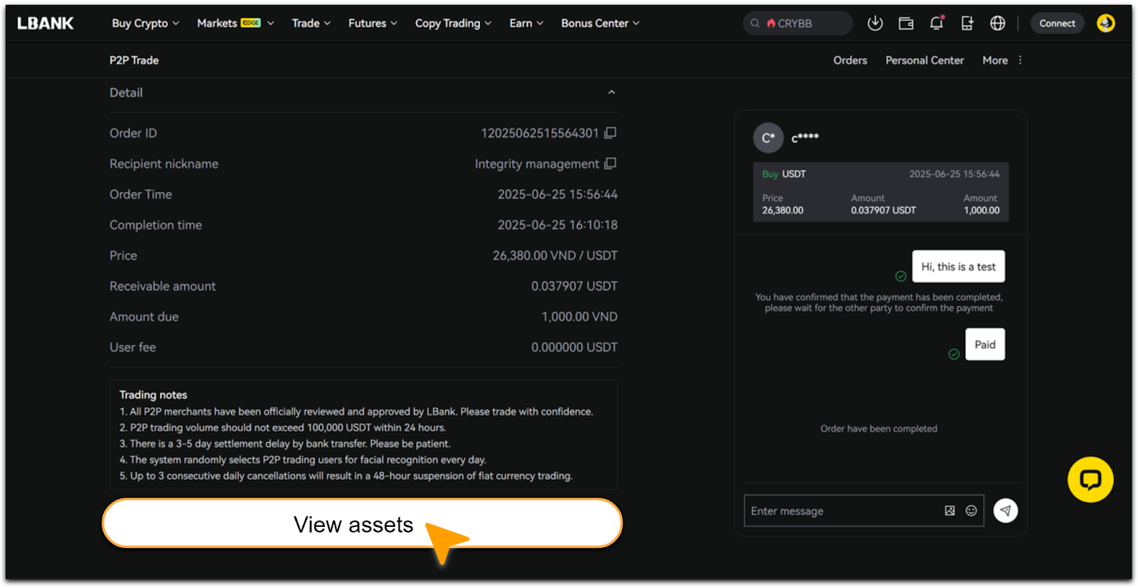 Once the seller confirms your payment, the cryptocurrency will be released to you. tap [View Assets] to check your assets.