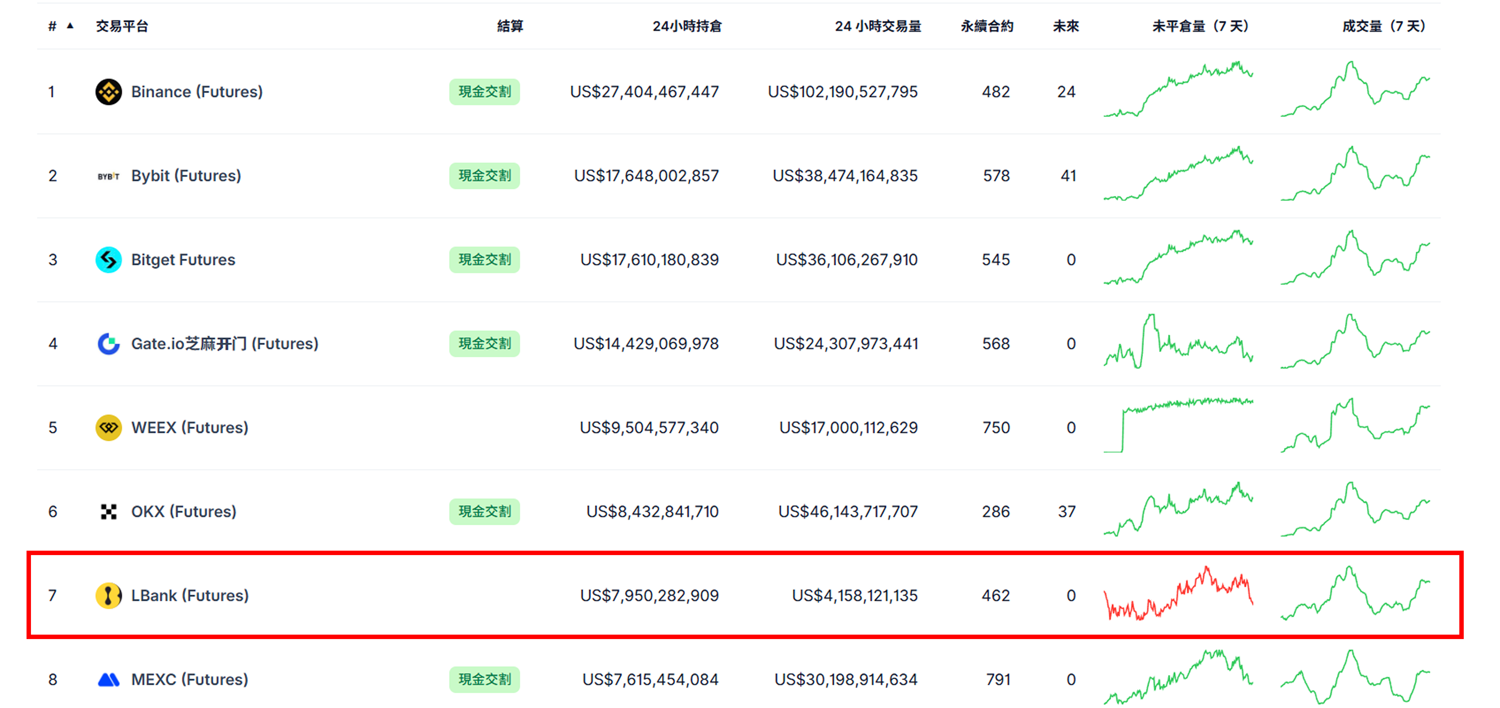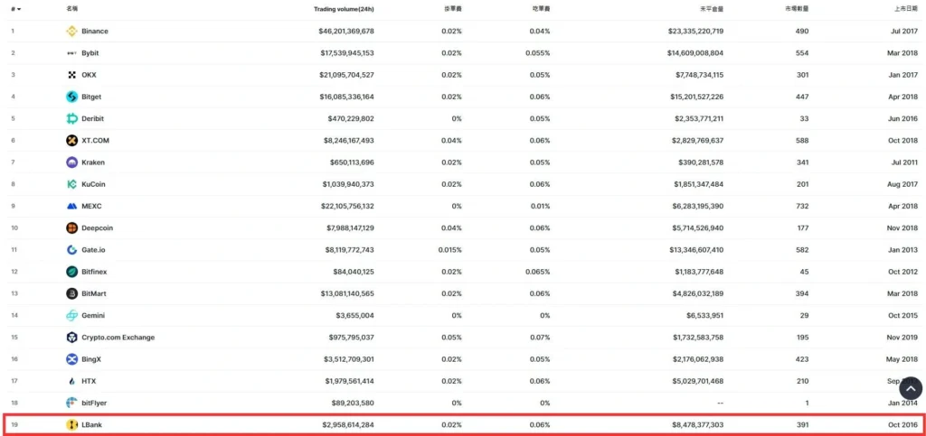CoinMarketCap 交易所排名顯示,LBank 現貨交易量在中心化交易所中排名第 17,而衍伸品交易則排名第 19 ; CoinGeko 的衍生品交易鎖排名則是第 7,LBank 的排名得益於其提供繁多加密貨幣交易兌供超過 1500 萬投資者選擇。