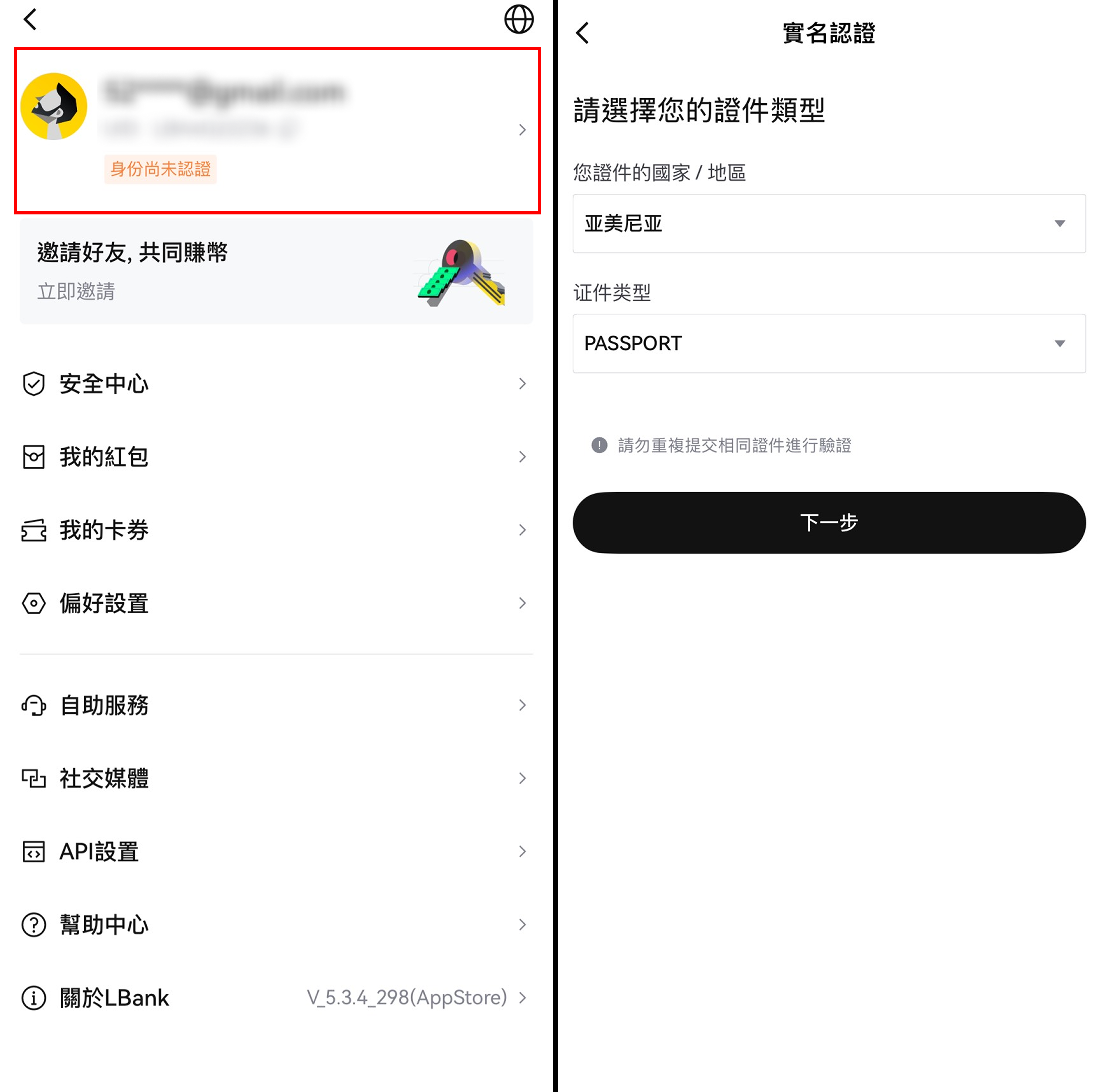 上傳身份證、護照或駕照完成 KYC 認證,提高帳戶使用權限。以下以 APP 為範例: