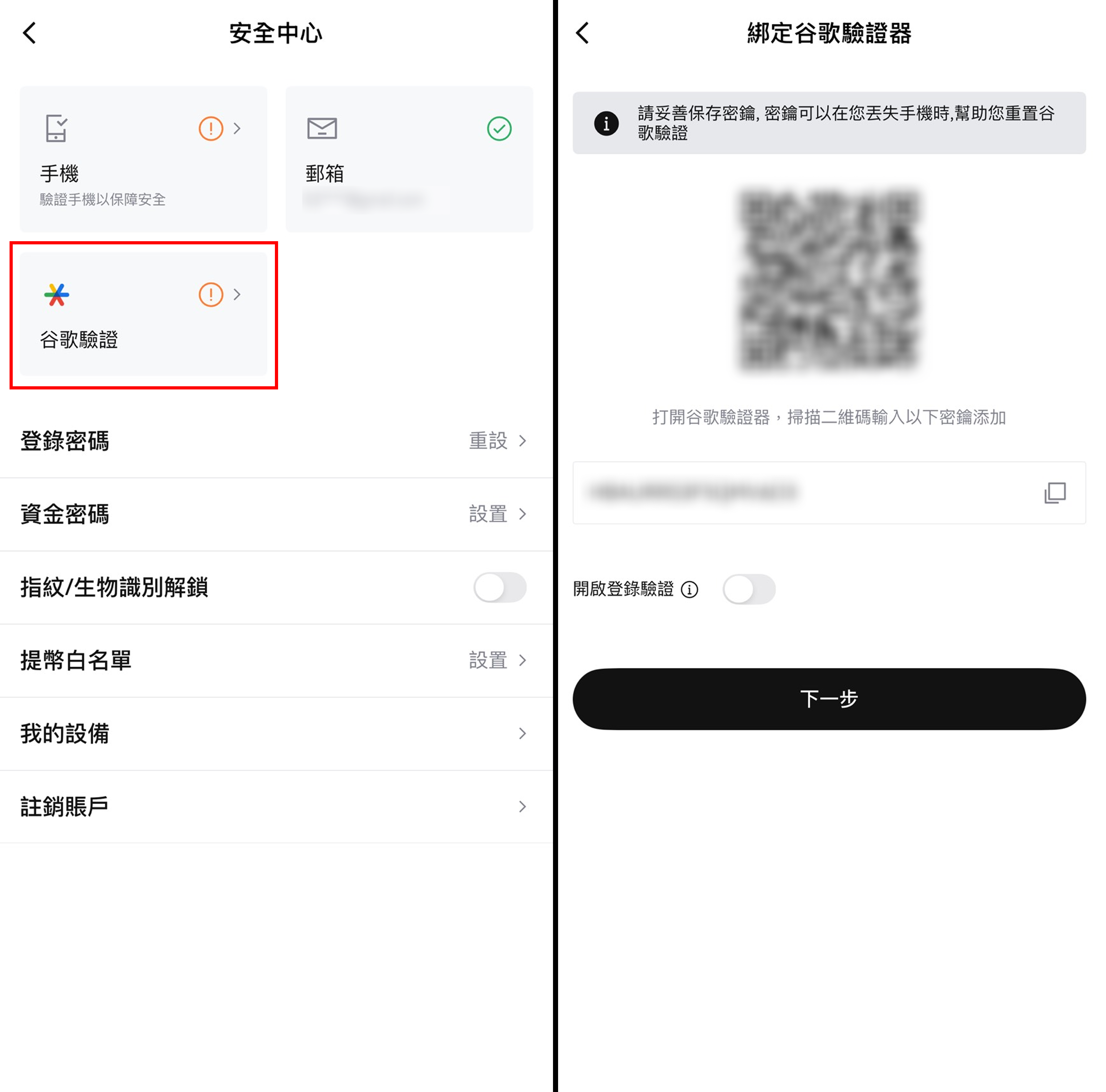 - 優先綁定手機、郵箱,再綁定谷歌驗證
