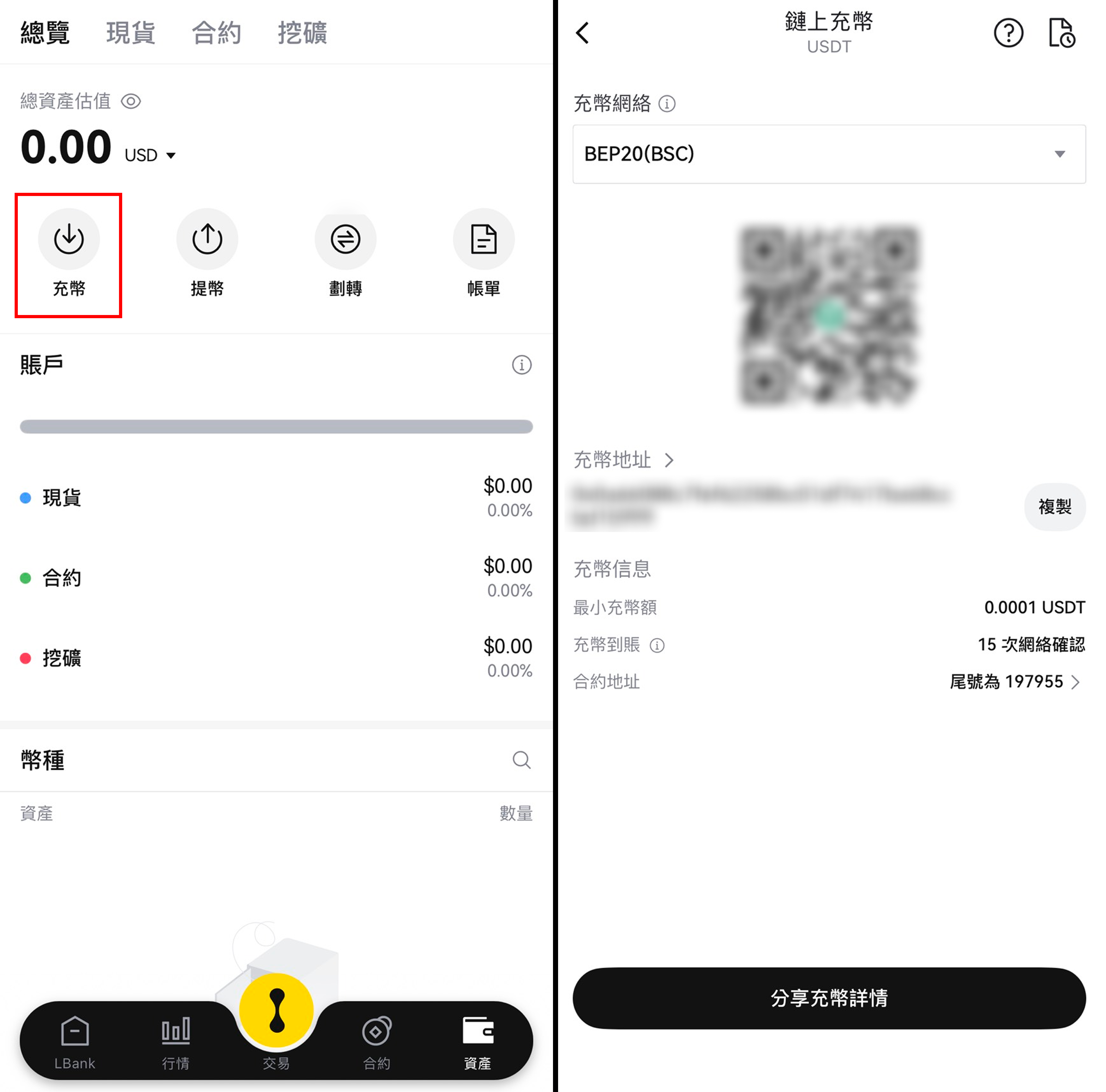 - 登入 LBank 官網(https://www.lbank.com/)或開啟 App,點擊「錢包」→「充幣」。