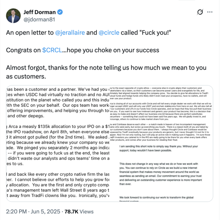 Circle 的 IPO 配股過程引發了加密圈內部意料之外的反彈。2025 年 6 月 5 日,Arca 的 Jeff Dorman 發表猛烈批評,指控 Circle 背叛早期支持者,因為他們在 IPO 中獲得的配額「極差甚至為零」。與此同時,傳統共同基金與對沖基金卻得到了相當優厚的配額。