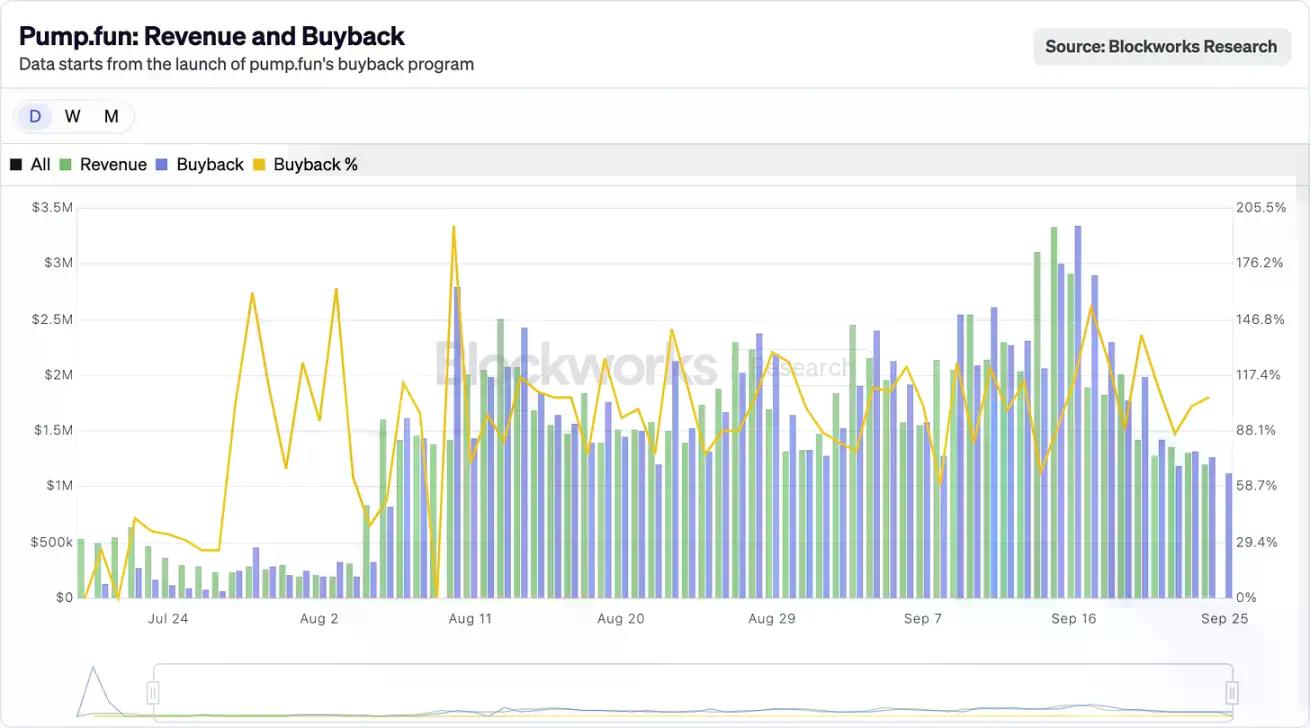 Hyperliquid 在 2025 年 8 月创下 1.06 亿美元手续费收入的纪录,其中超 90% 被用于在公开市场回购 HYPE 代币。与此同时,Pump.fun 的日收入曾短暂超过 Hyperliquid——2025 年 9 月某日,该平台单日收入达 338 万美元。这些收入最终流向何处?答案是 100% 用于回购 PUMP 代币。事实上,这种回购模式已持续了两个多月。