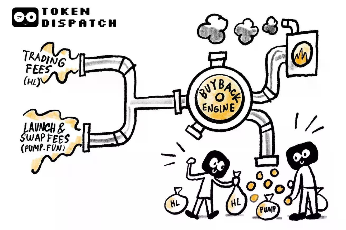 该行业的两大「收入引擎」——永续期货交易所 Hyperliquid 与 Meme 币发行平台 Pump.fun—— 正将几乎每一分手续费收入都用于回购自家代币。