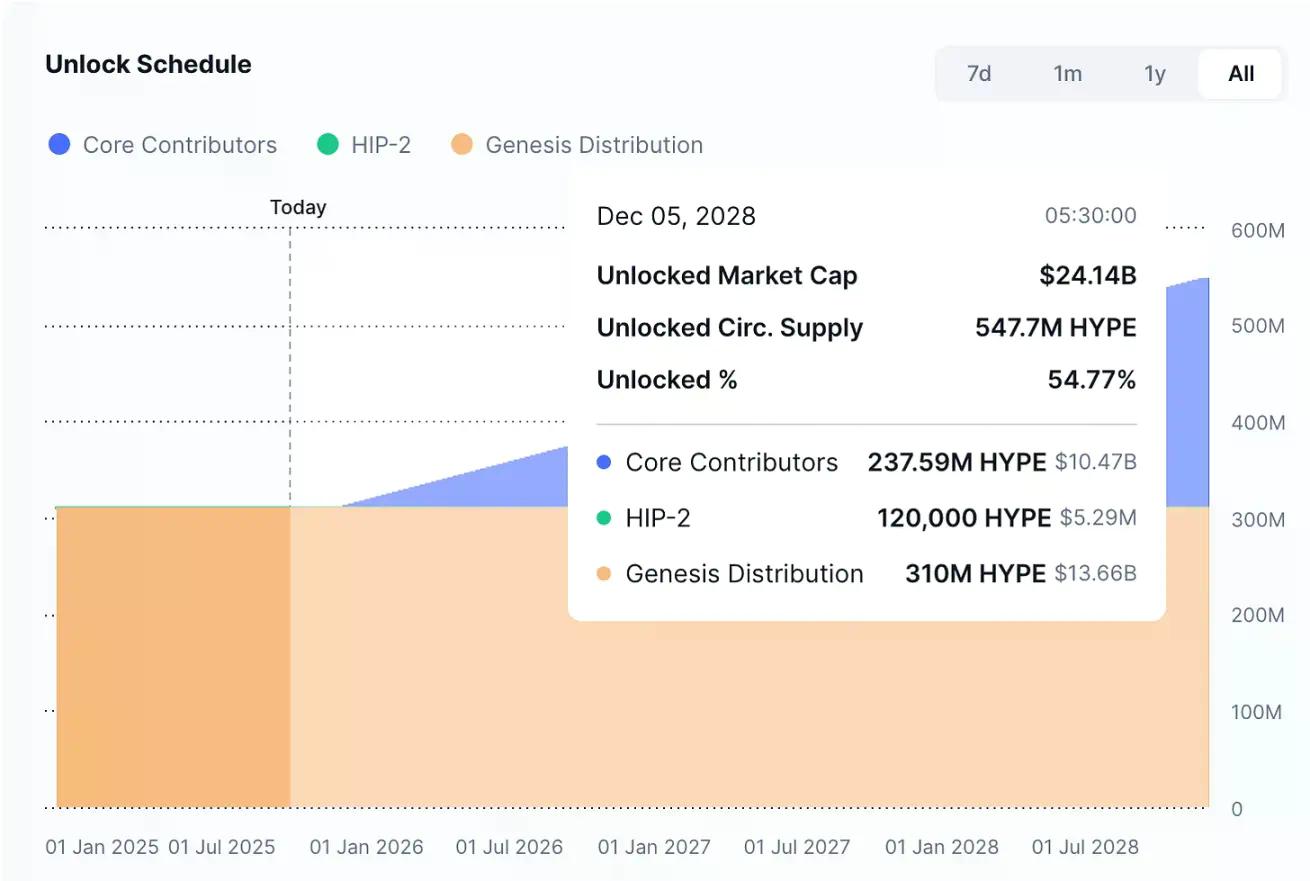 苹果无需担心「2 亿股新股票一夜流入市场」,但 Hyperliquid 面临这一问题:从 2025 年 11 月开始,价值近 120 亿美元的 HYPE 代币将向内部人员解锁,其规模远超日常回购量。