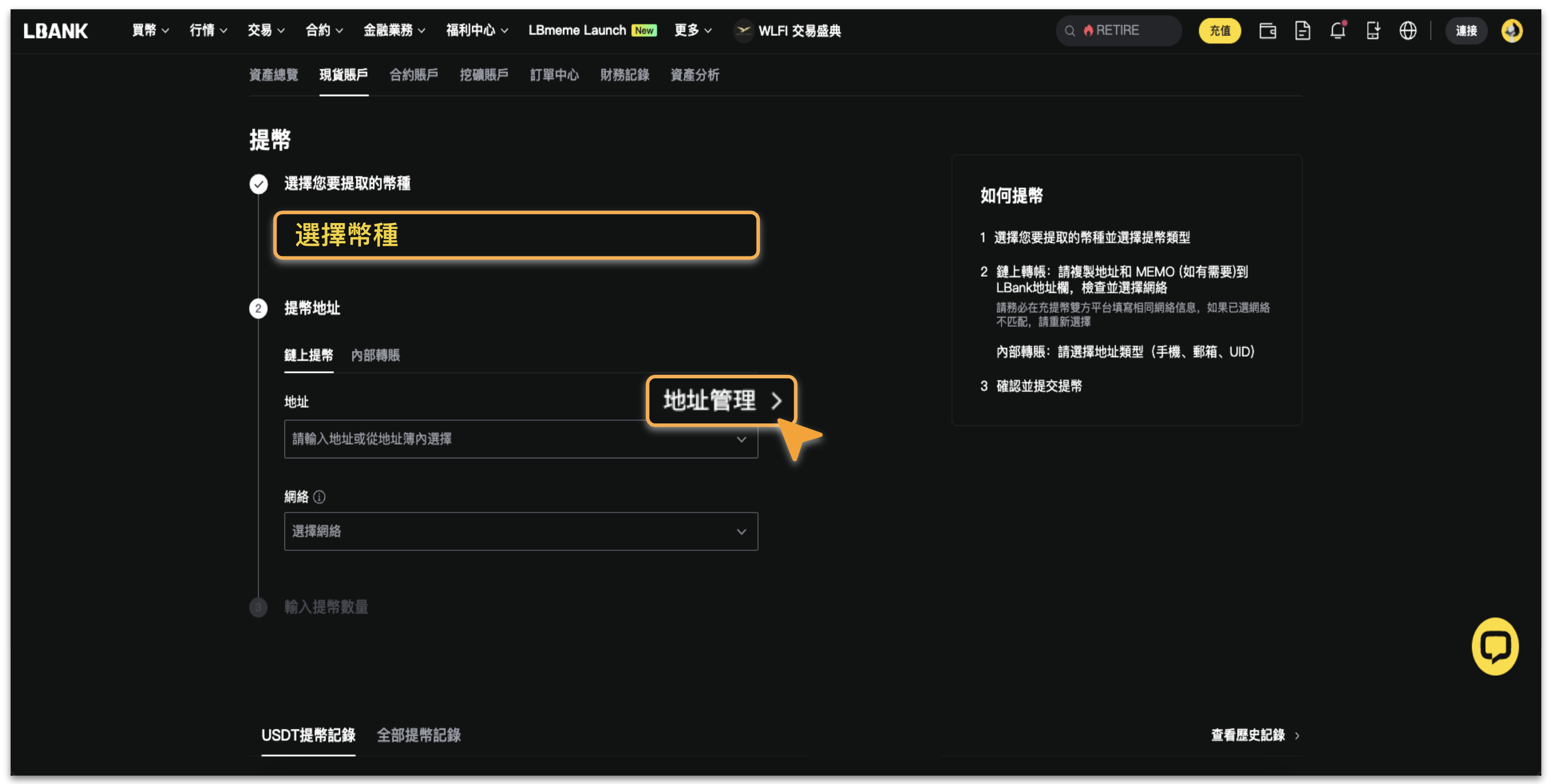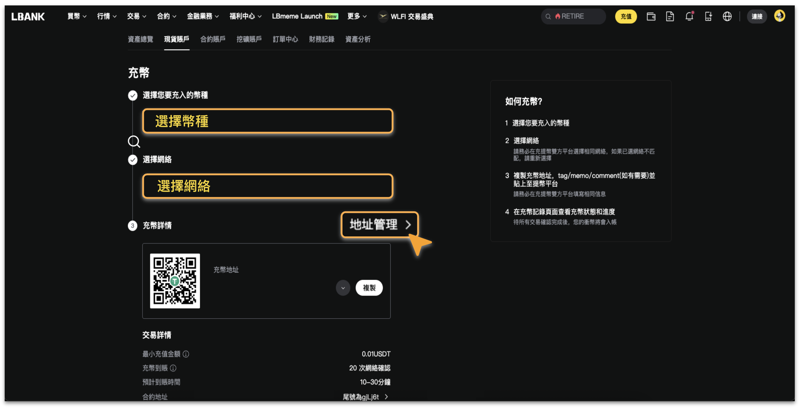 選擇您要充入的幣種與網絡,點擊【地址管理】。