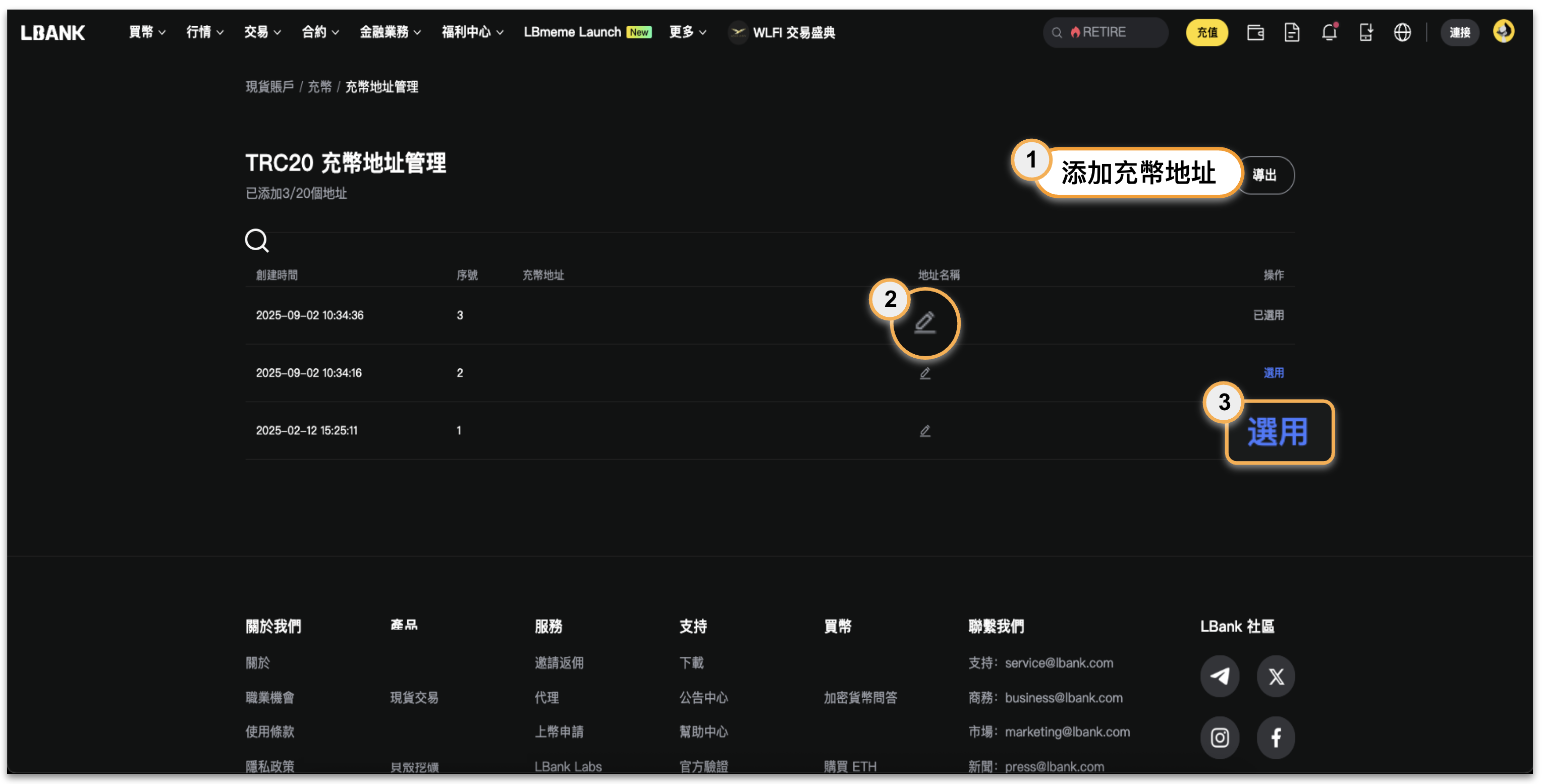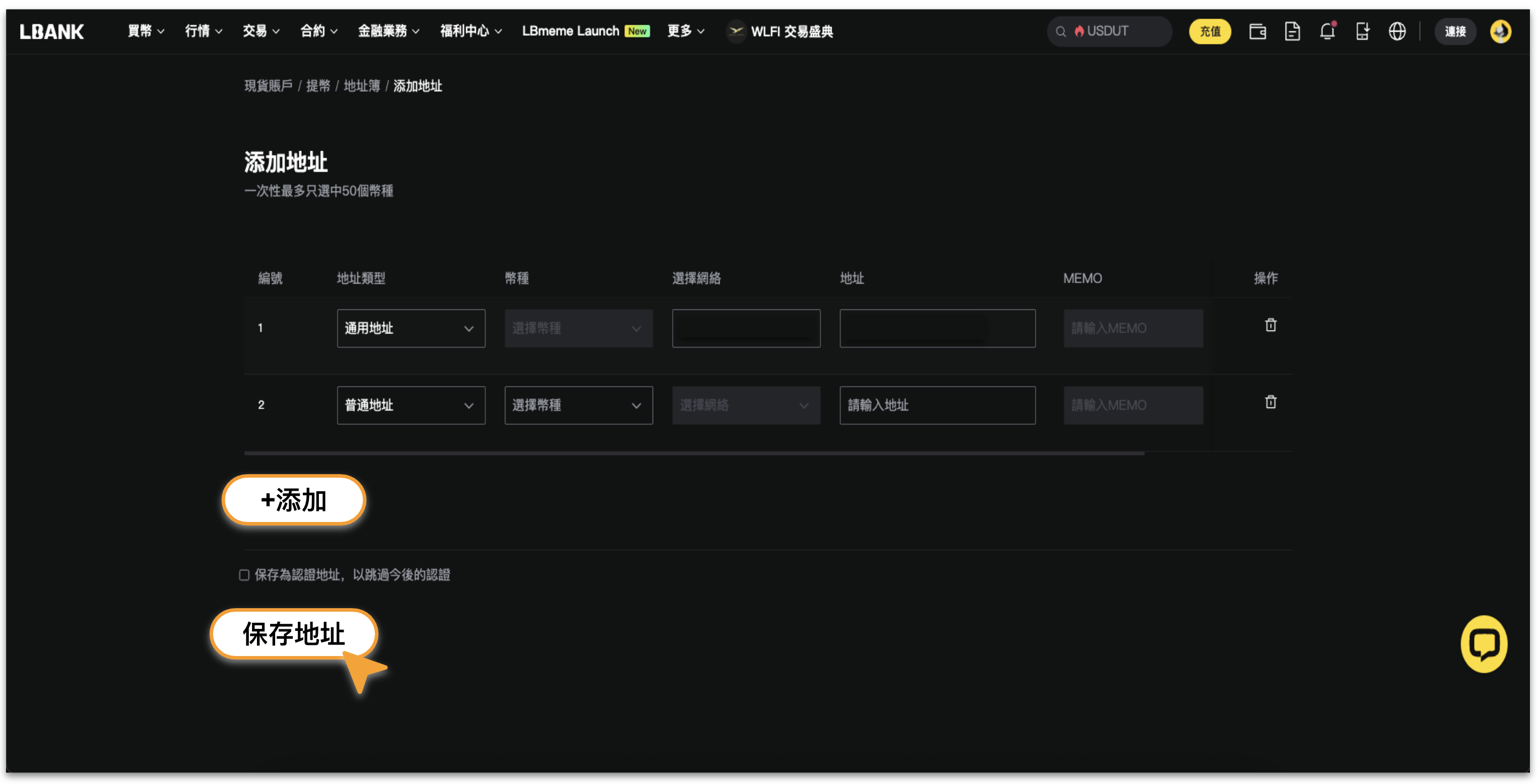 添加地址:點擊【添加充幣地址】,為該網絡新增充幣地址。