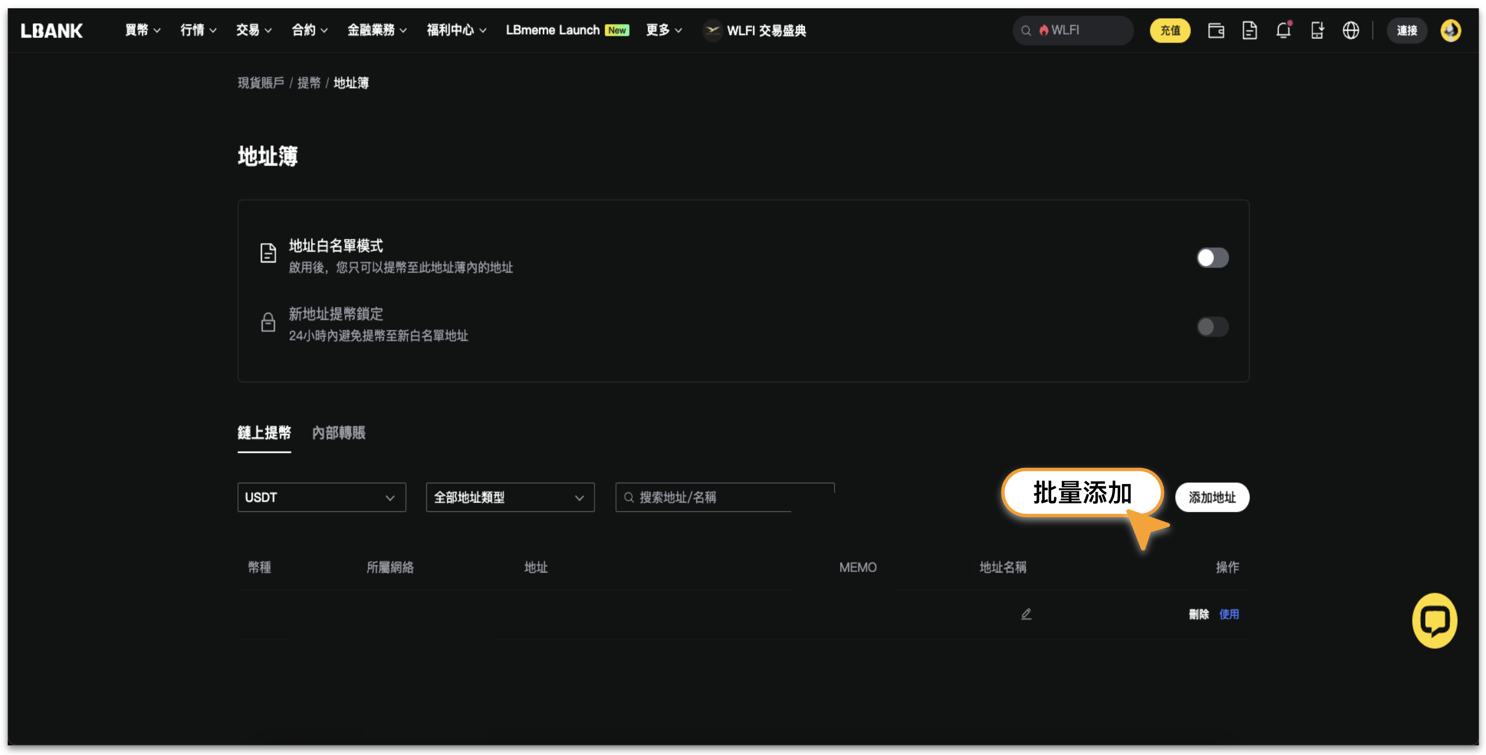 地址白名單模式:勾選【地址白名單模式】後,僅提幣地址簿中的地址可進行提幣操作。開啟此功能後,用戶將無法在提幣窗口輸入新的錢包地址。