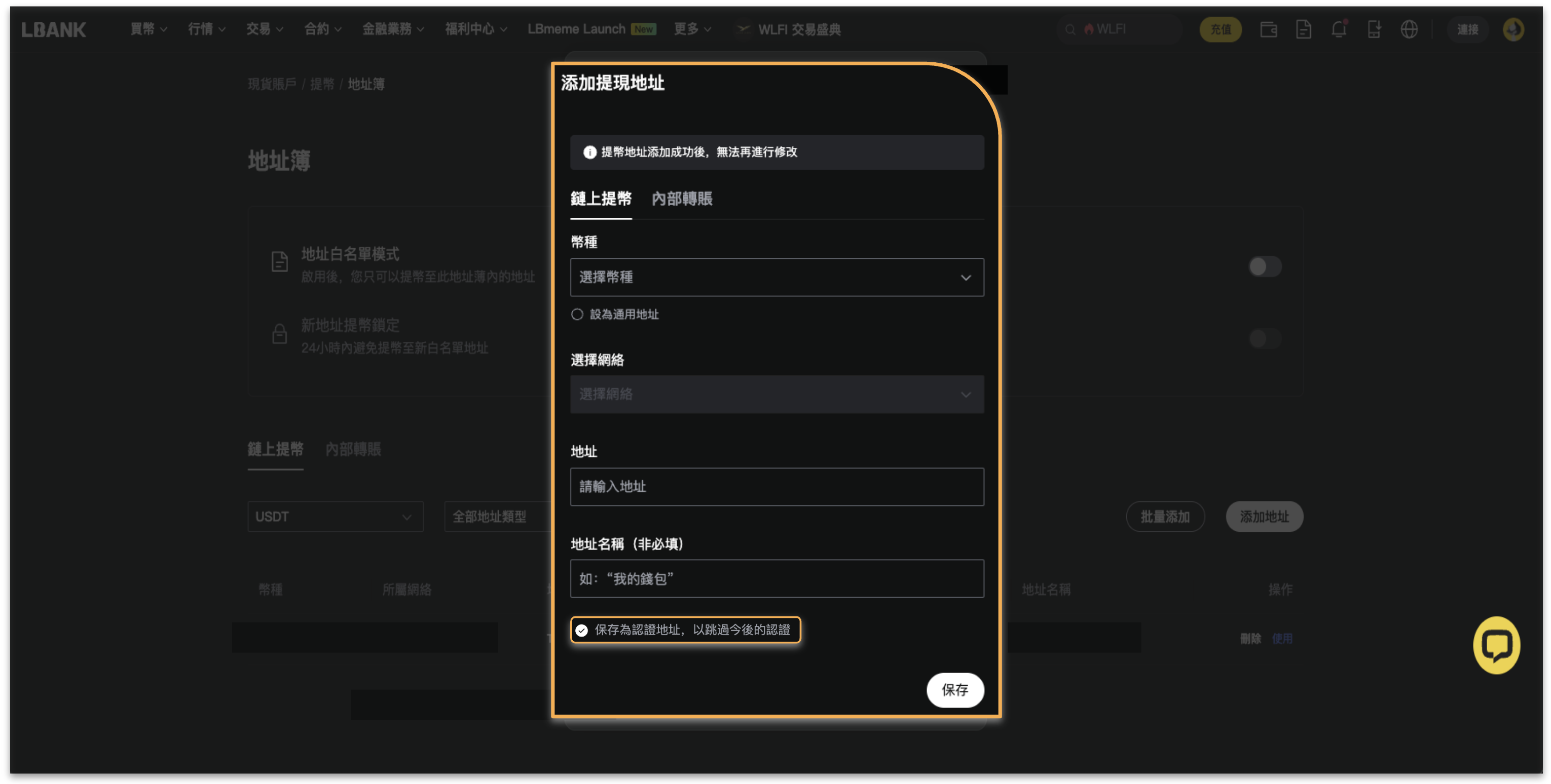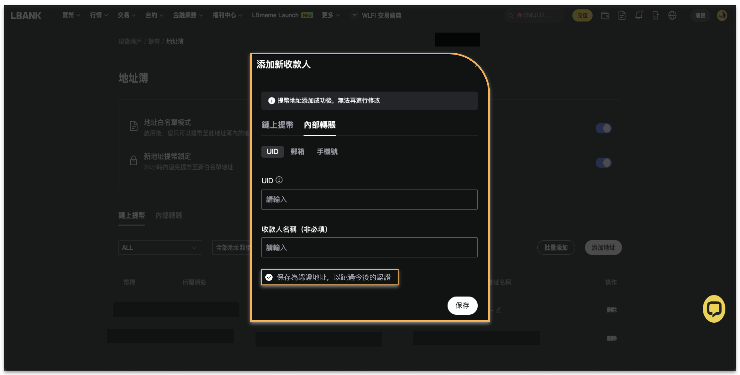 - 在添加地址彈窗中,勾選【保存為認證地址,以跳過今後的認證】。