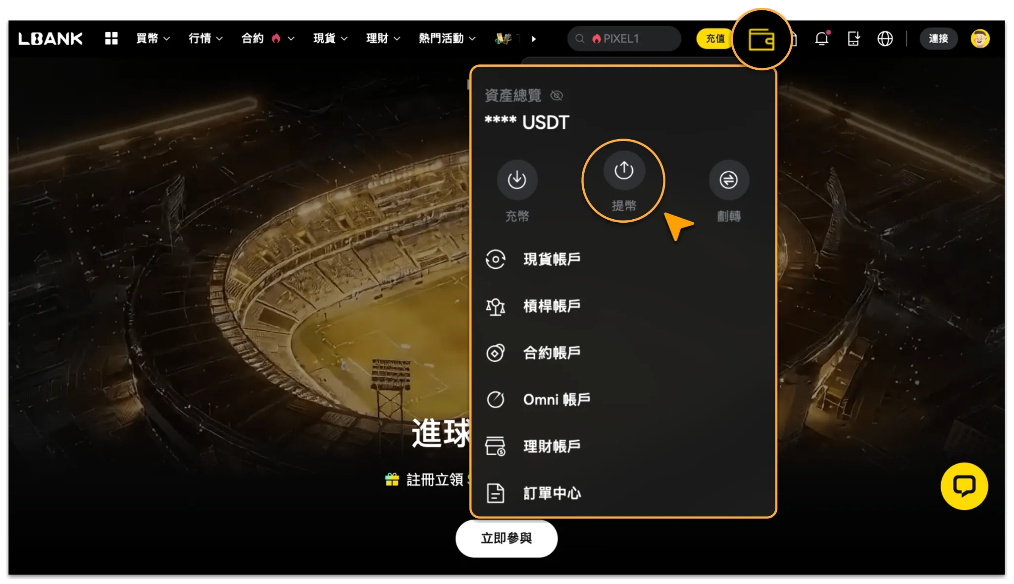 登錄 LBank 官網,點擊「資產 >「提幣」;如您尚未綁定安全驗證方式,請先完成相關安全設置(例如開啟谷歌驗證等),以保障賬戶資金安全。