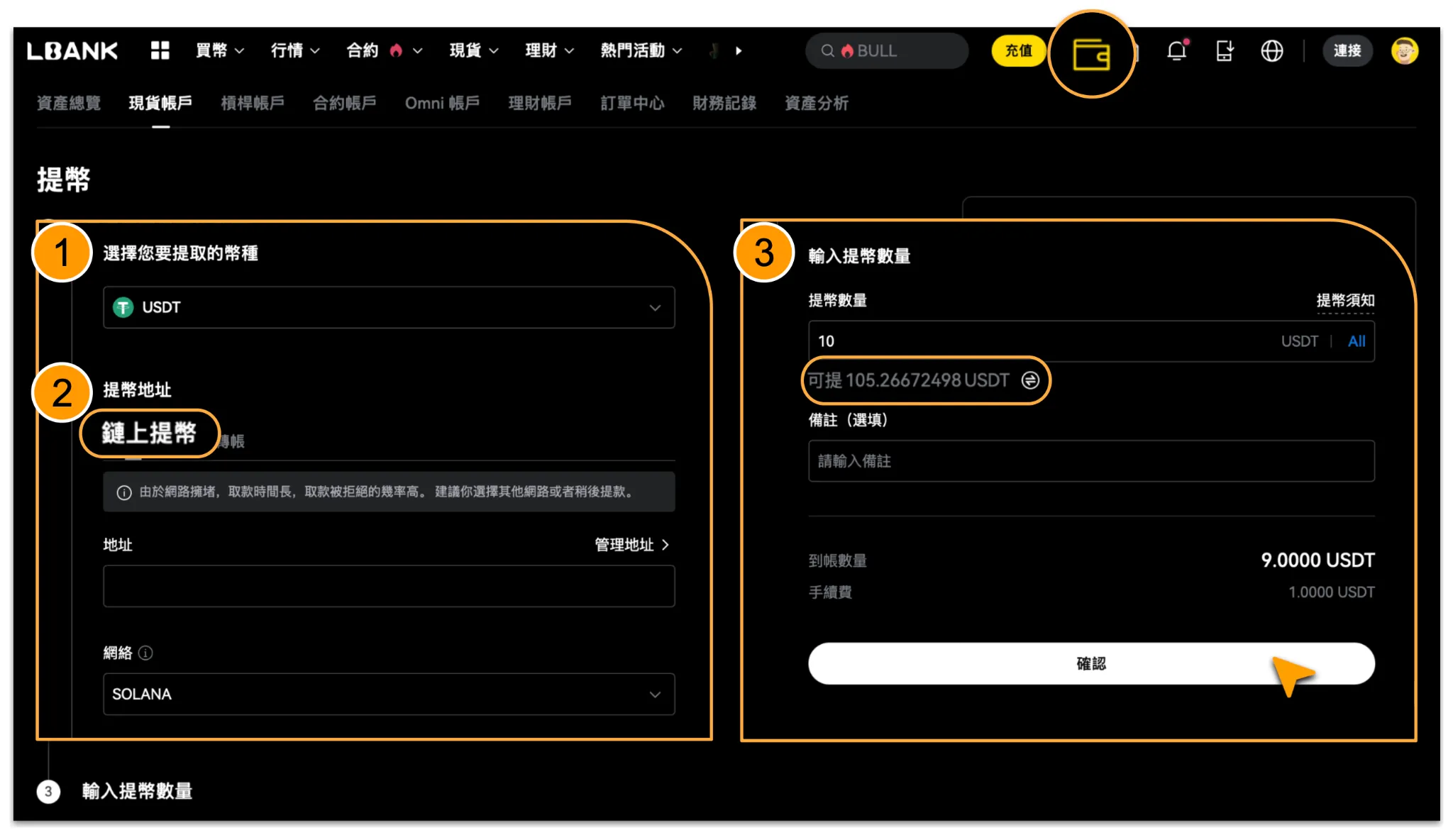 鏈上提幣涉及地址、網絡及鏈上手續費等多項信息,請您在操作前仔細閱讀頁面提示並確認填寫內容準確無誤。為保障資產安全,建議您提交申請前再次核對提幣信息;如有疑問,請聯繫 LBank 官方客服。