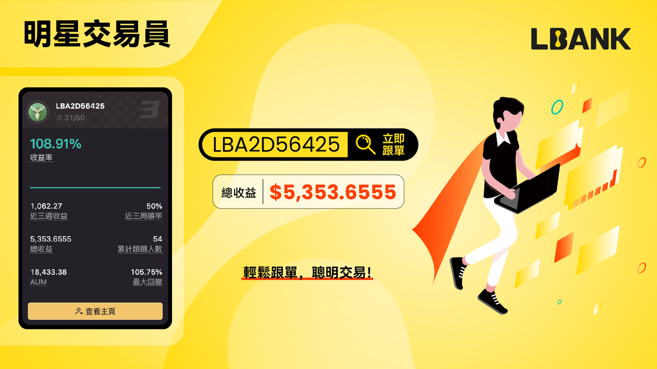 本週交易員動態2.1 明星交易員:LBA2D56425以總收益 $5,353.6555成為本周明星交易員,輕鬆跟單,聰明交易,快來開始你的跟單之旅吧!