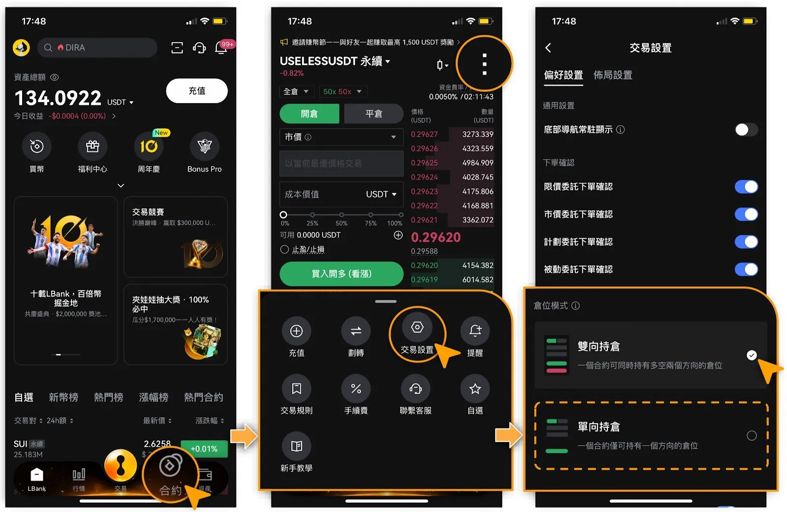 登入 LBank App, 點擊「合約」,進入合約交易頁面;
