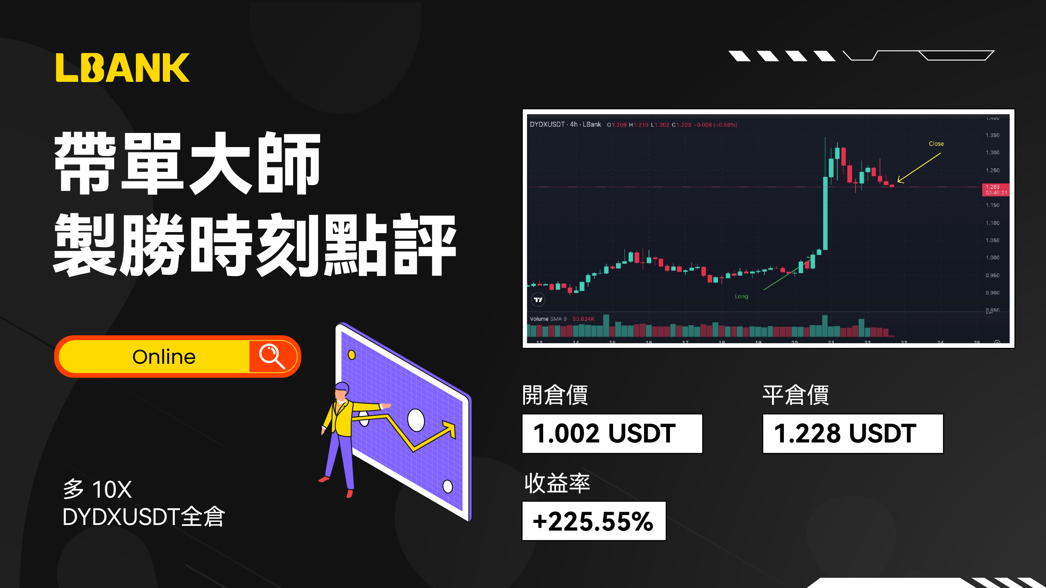 累計完成9次交易目標,可獲得累計5,000 USDT帶單資金,並成爲LBank領航帶單員,每月最高可獲取500 USDT月薪和跟單者分潤!